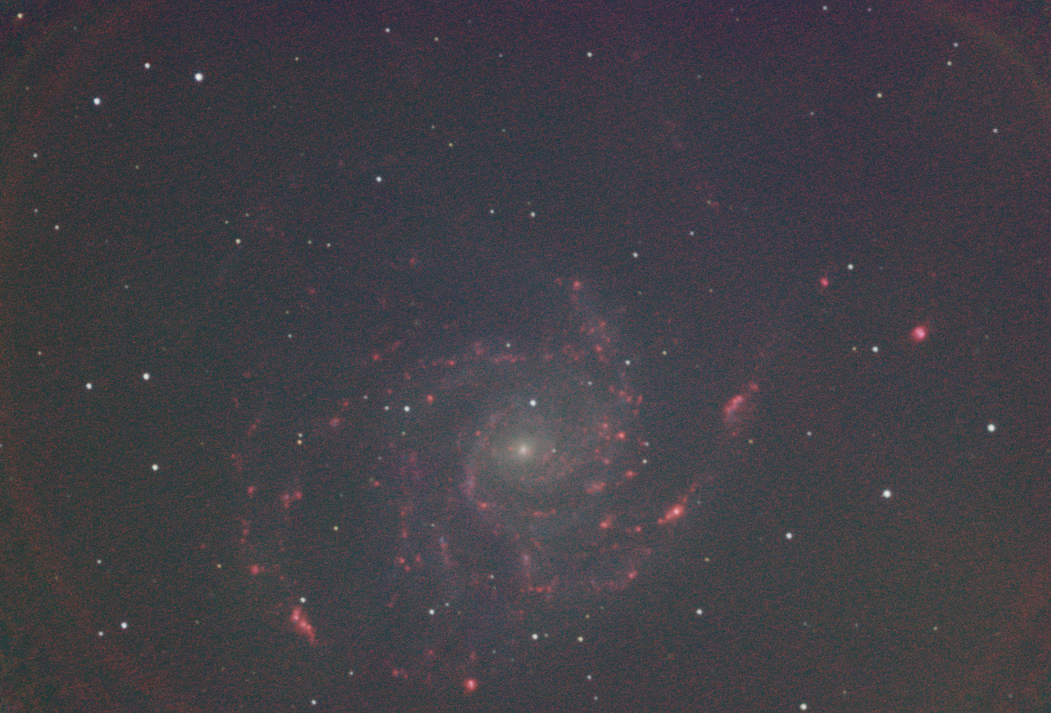 Description: Is that a pinwheel you would place in your yard to spin in the wind? Only if your yard is 200,000 light-years across! Messier 101, also known as the pinwheel galaxy, is one of the finest examples of a spiral galaxy, with its disk oriented face-on towards us. Previous interactions with other nearby galaxies have led to a clearly defined spiral structure, easily seen through the broadband Soan r' and Sloan g' filters, speckled with star-forming regions that glow brightly when viewed through an H-alpha filter. H-alpha, appearing as a deep red to human eyes, was assigned to the image's red channel, followed by the Sloan r' data in the green channel and the Sloan g' data in the blue channel. Unfortunately, frost on the image sensor has resulted in artifacts near the image's corners. Dust movement between the capture of the image and the capture of flat frames to calibrate out the impacts of dust in the optical path meant that dark spots in the images remained and had to be manually removed using GIMP before final image processing. Despite the significant detail shown in this image, there is a noticeable amount of noise, especially in the red channel. This simply means that the image would benefit from the inclusion of a longer total integration time due to Messier 101's low surface brightness.