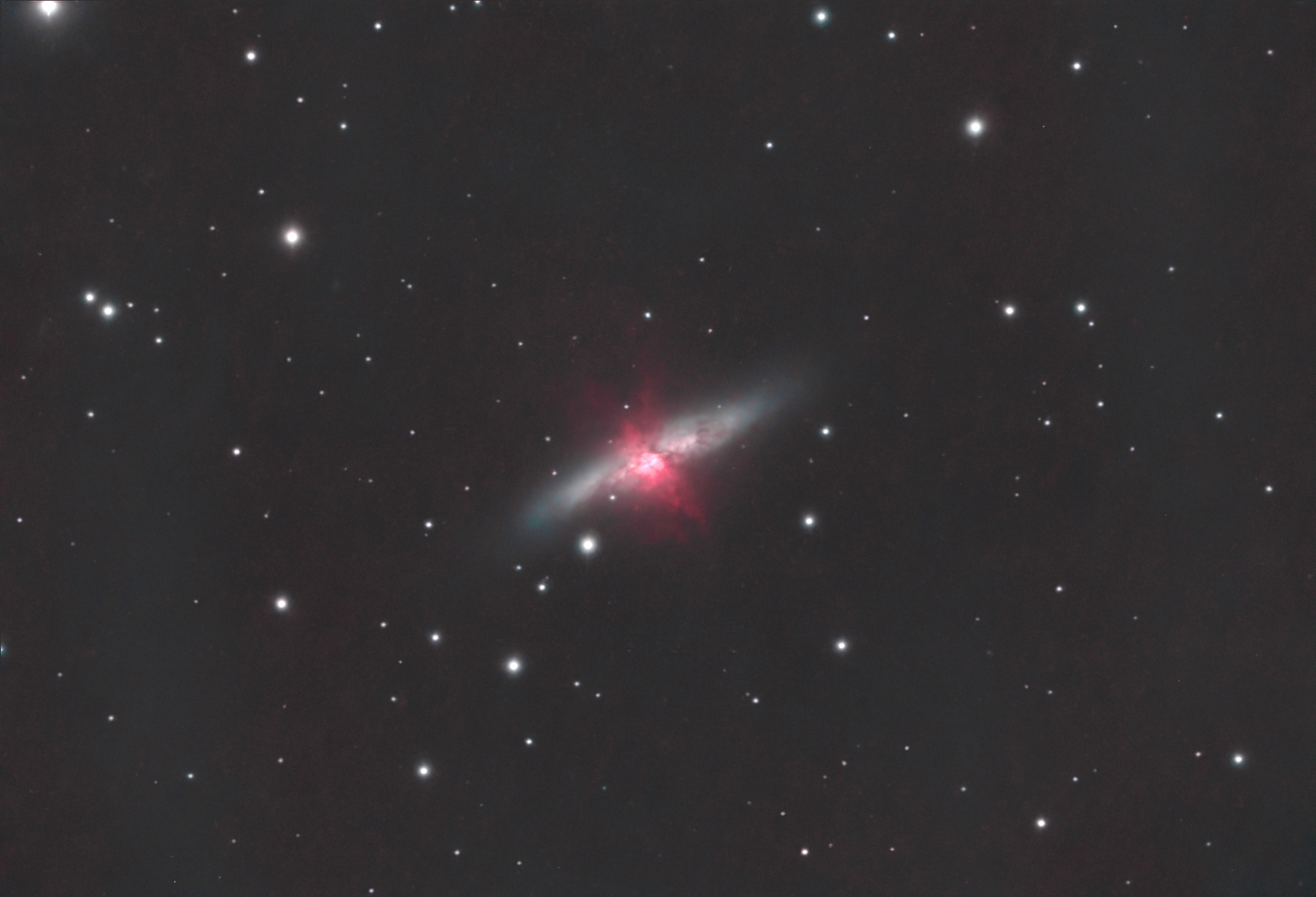 Description: Messier 82, colloquially known as the cigar galaxy, is one of the best galaxies to observe during the Northern Hemisphere spring. While technically a spiral galaxy, we see it nearly edge-on, so it appears more like an oval or a cigar. In contrast to the other image of M82 featured here, this group opted for a closer view of the galaxy, using only broadband filters to emphasize the dust lanes within the galaxy over the ionized gas emanating from it. Despite the use of calibration frames, several artifacts from dust in the equipment persisted through the stacking process. These had to be manually corrected using an additional image processing software, Adobe Photoshop, in this case. This image, along with the other image of M82 taken this year, is an example of how atmospheric conditions impact how sharp deep-sky images can be. While larger telescopes have a better theoretical resolution than smaller telescopes, the motion of the atmosphere blurs images more than the theoretical limits of both telescopes used. This means that when you overlay the two images and adjust for the scaling, the disks of the stars are essentially the same size!