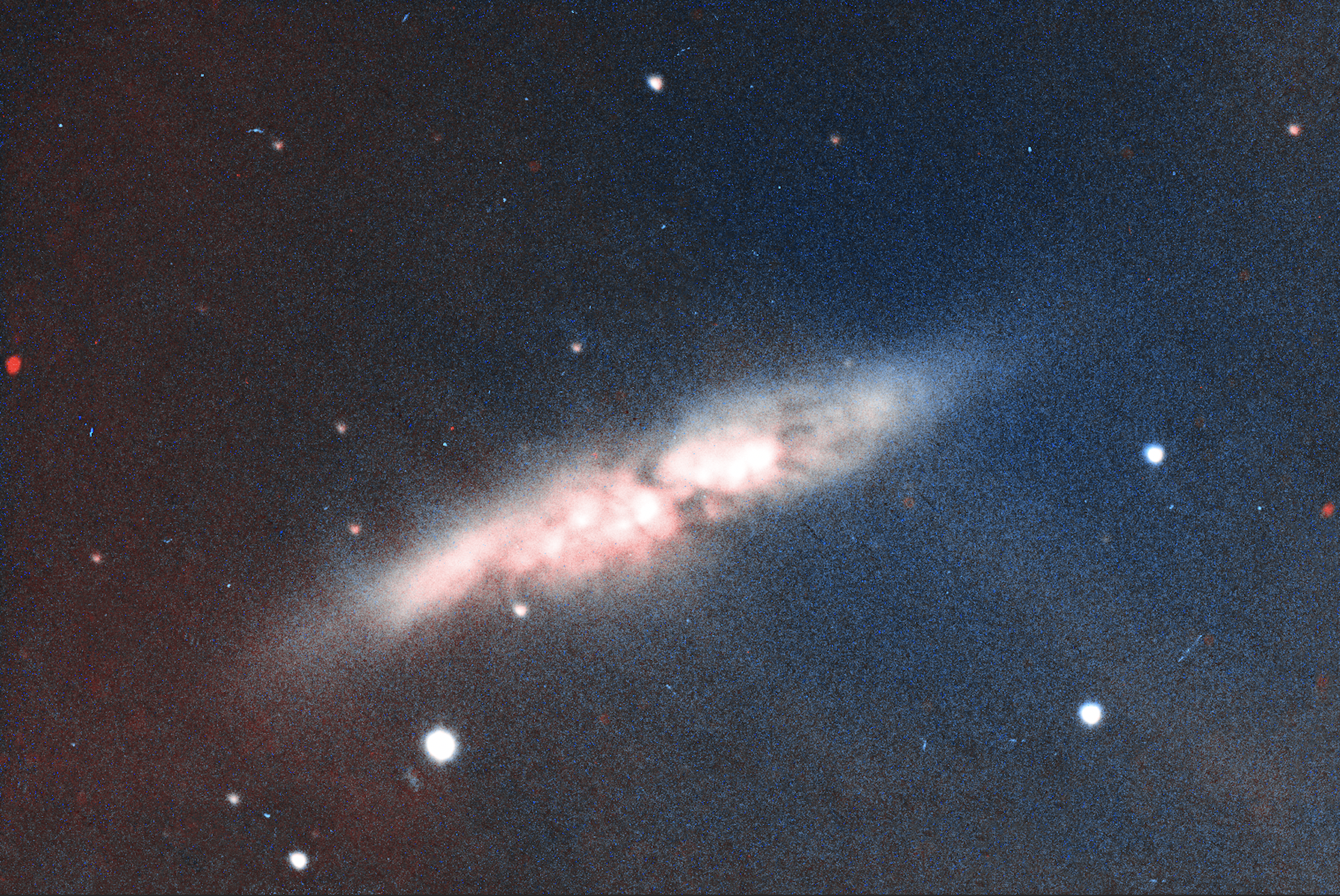 Description: Have you ever seen a galaxy explode? In this incredible image by ASTR 288T students, you can see the glow of ionized hydrogen gas as it is driven out of the galaxy by the aftermath of a recent episode of intense star formation. Created using the UMD observatory's 7" refractor with an hour of exposure time through a Hydrogen-alpha filter, an optical filter designed to let through a single, specific color of light emitted by ionized Hydrogen; and an additional hour of exposure time through a Sloan-g' filter to capture the bluish light emitted by young stars, the image showcases the dynamic nature of this "island universe" as we look at it, 10 million light years further than the stars in the image that reside comfortably within our own galaxy. To go from the monochrome images recorded by the camera to the full-color image you see here, the red, green, and blue color channels in the image were filled in with data from the filters, with the red channel filled with the H-alpha data and the green channel filled with the Sloan-g' data. Since only two filters were used when gathering the data for this image, this group opted to set the blue channel as the average of the H-alpha and g' images. These color channels were then adjusted using Siril's color calibration tool to approximate a natural color image. After stretching the image to reveal the galaxy from the background sky, noise reduction using NoiseXTerminator, and sharpening with BlurXTerminator, Messier 82 (M82) isn't the only galaxy visible. If you have sharp eyes, you might be able to spot LEDA 2732102 in the upper left, lying roughly 150 million light years beyond even M82.