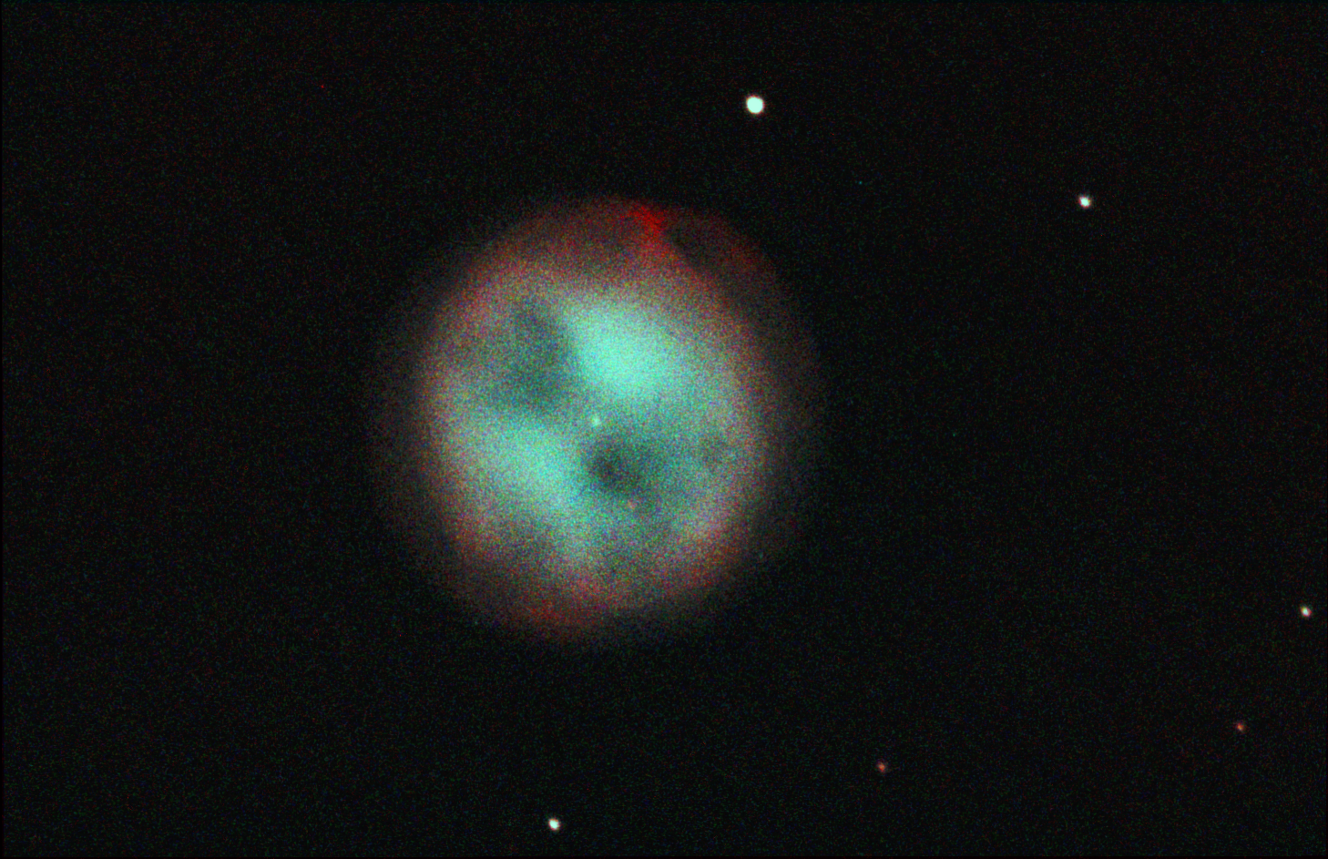Description: Did a colorful owl fly in front of our telescope? No, a star died! This avian pareidolia is of a planetary nebula, a type of emission nebula that forms when a star roughly the mass of our sun dies. The remnant of the star that produced this nebula, known as WD 1111+552, is an object known as a white dwarf. The high-energy ultraviolet light coming from this object provides the energy needed to cause the gases in the planetary nebula to fluoresce. These fluorescent emissions happen at very specific colors and can be captured using narrowband filters. For this image, red light from Hydrogen and cyan light from Oxygen were captured using a monochrome camera and then digitally combined into this full-color image. The speckles you see in this image are simply a result of the limited exposure time and would disappear if we had been able to collect images of this object for closer to 10 hours.