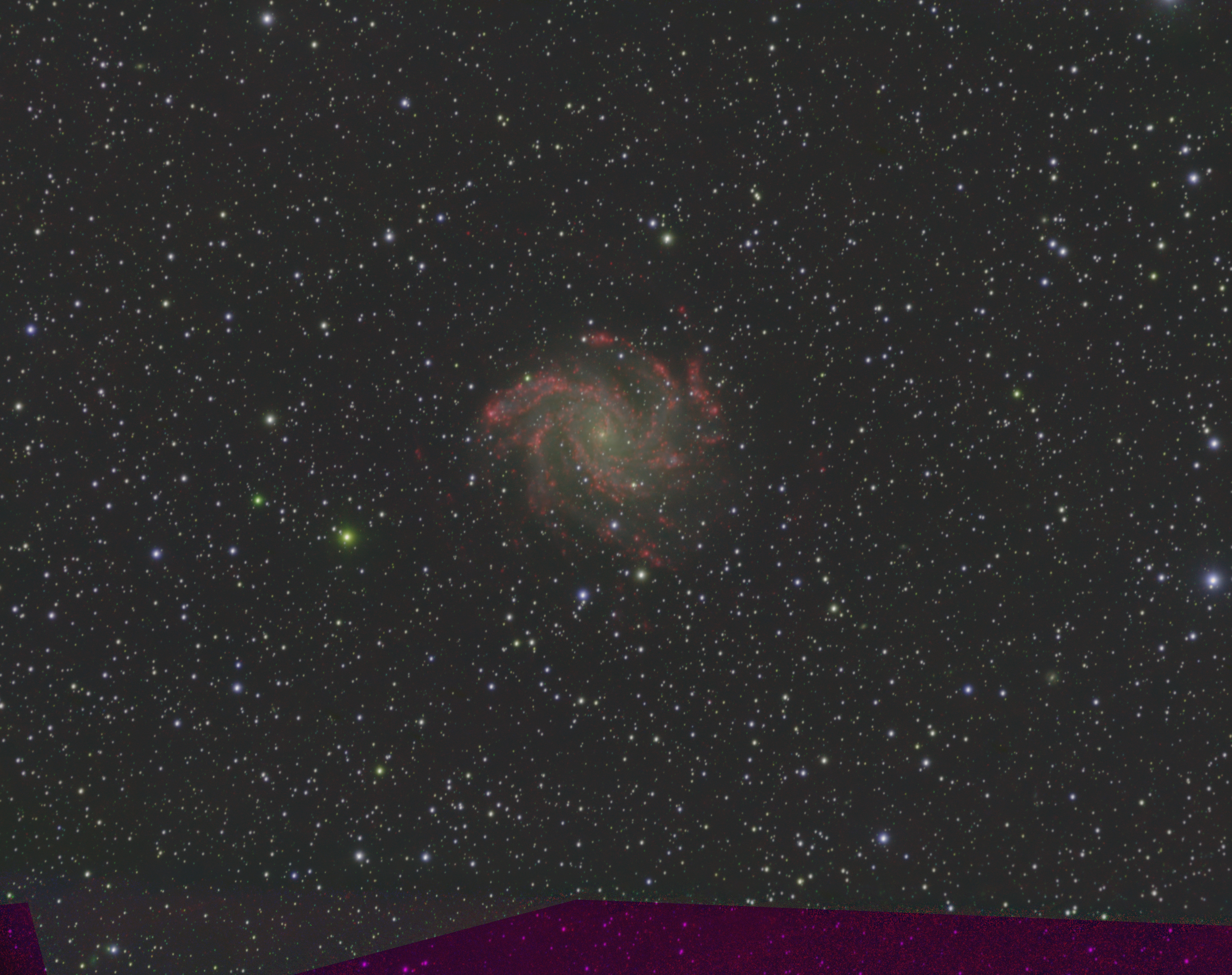 Because two different groups observed NGC 6946 in slightly different filters, I combined their data to produce the attached image. Sloan g' images were mapped to the Blue channel of the photo, Sloan i' images were mapped to the Green channel of the photo, and H-alpha images were mapped to the red channel of the photo. This ordering is somewhat backwards, as the Sloan i' filter lets through longer wavelengths of light than H-alpha, so very red objects will appear green rather than red, but it does mean that the star-forming regions in NGC 6946 show the red glow of H-alpha.