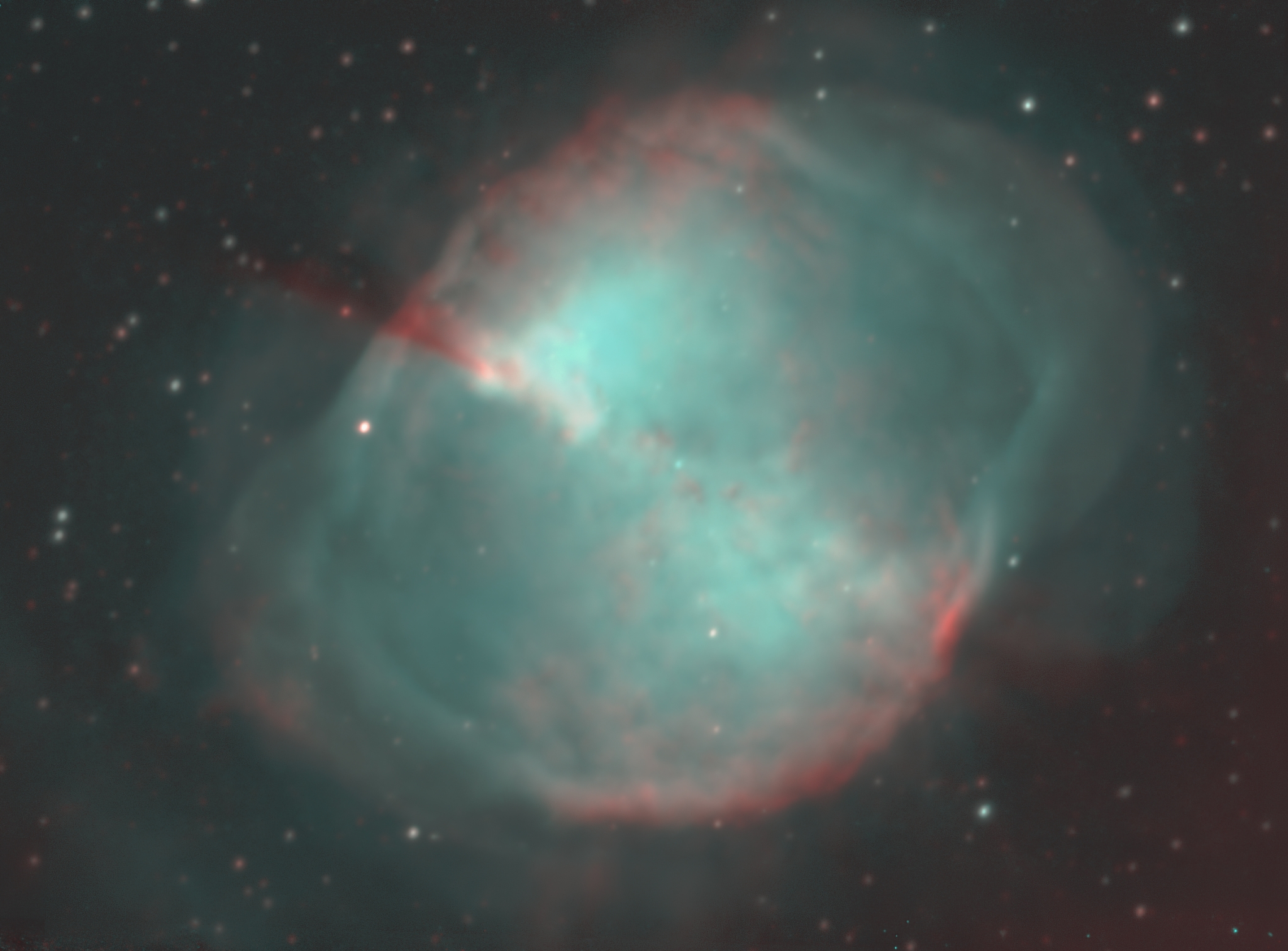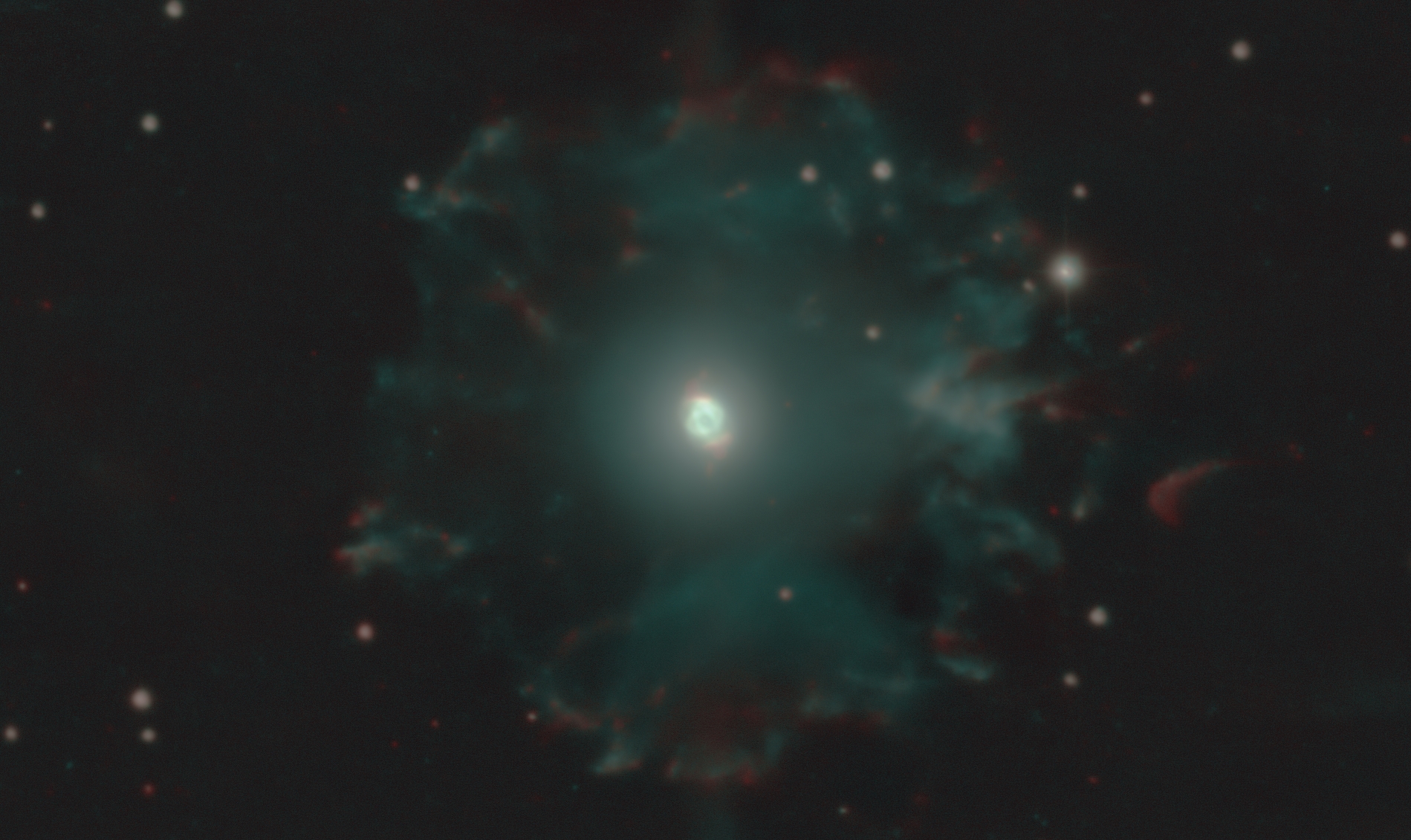 [O III] images have been mapped to cyan in the picture, and H-alpha images have been mapped to red.