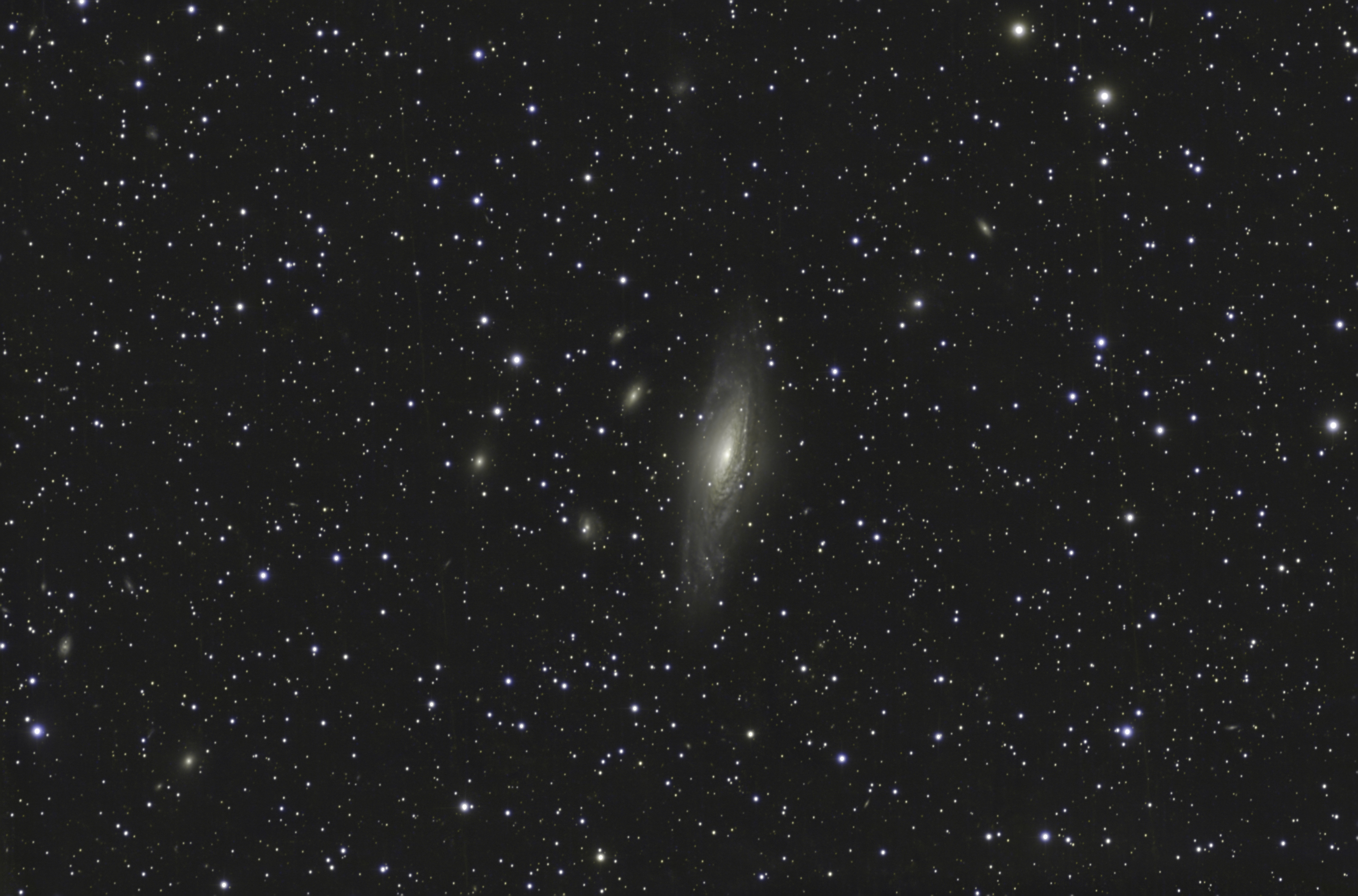 This target is interesting in that it is actually made up of two different galaxies, somewhat overlaid on each other. The main galaxy, NGC 1023, is the large, red, lenticular galaxy in the center of the image, but there is also NGC 1023A, which is apparently a satellite galaxy of NGC 1023 off to the left of the image, which is somewhat more blue than NGC 1023. There also seems to be different 'tidal shells' in NGC 1023 where there are steps in the galaxy's brightness; maybe due to past gravitational interactions with its satellites?