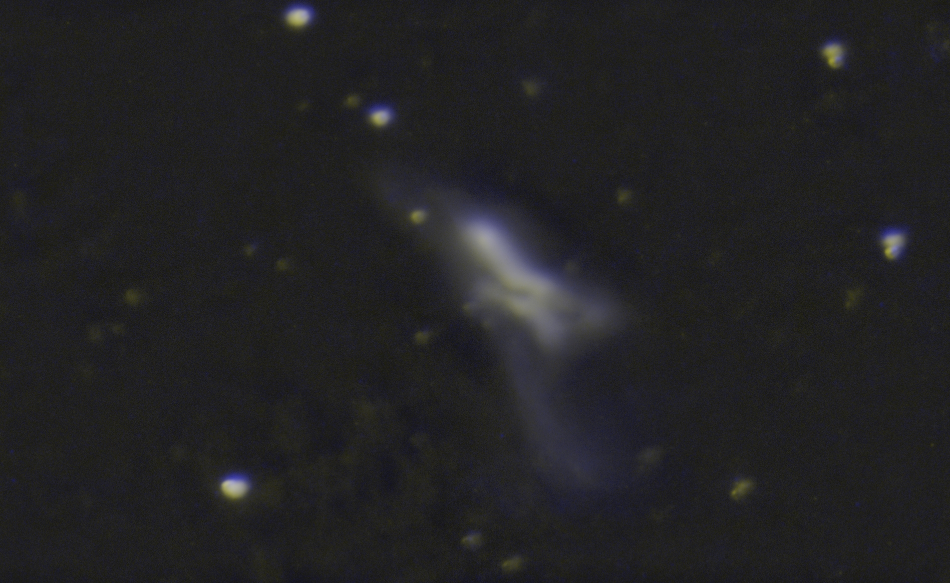 Sloan r' images have been mapped to yellow, and Johnson-Cousins B images have been mapped to blue.
