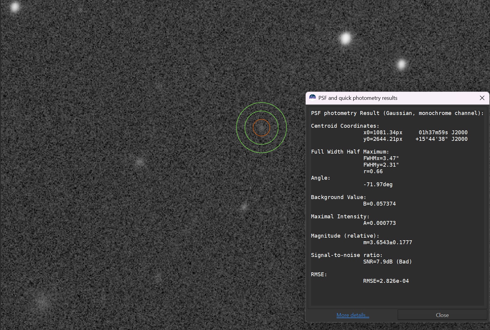 This image may potentially now hold the record for the most distant object seen by the UMD observatory, as quasar SDSS J013759.15+154438.1 can be seen to the left of the image, with a redshift of z = 3.63, which corresponds to a light travel time of approximately 11.5 billion years. I did confirm that SDSS J013759.15+154438.1 had a statistically significant detection (7.9 standard deviations above noise).