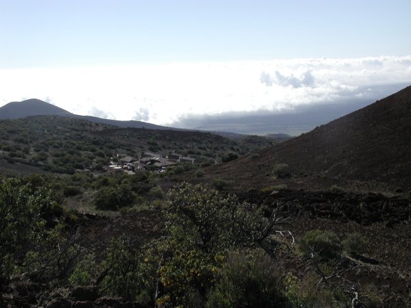 Hale Pohaku. Clouds cover the saddle between Mauna Kea and Mauna Loa.
