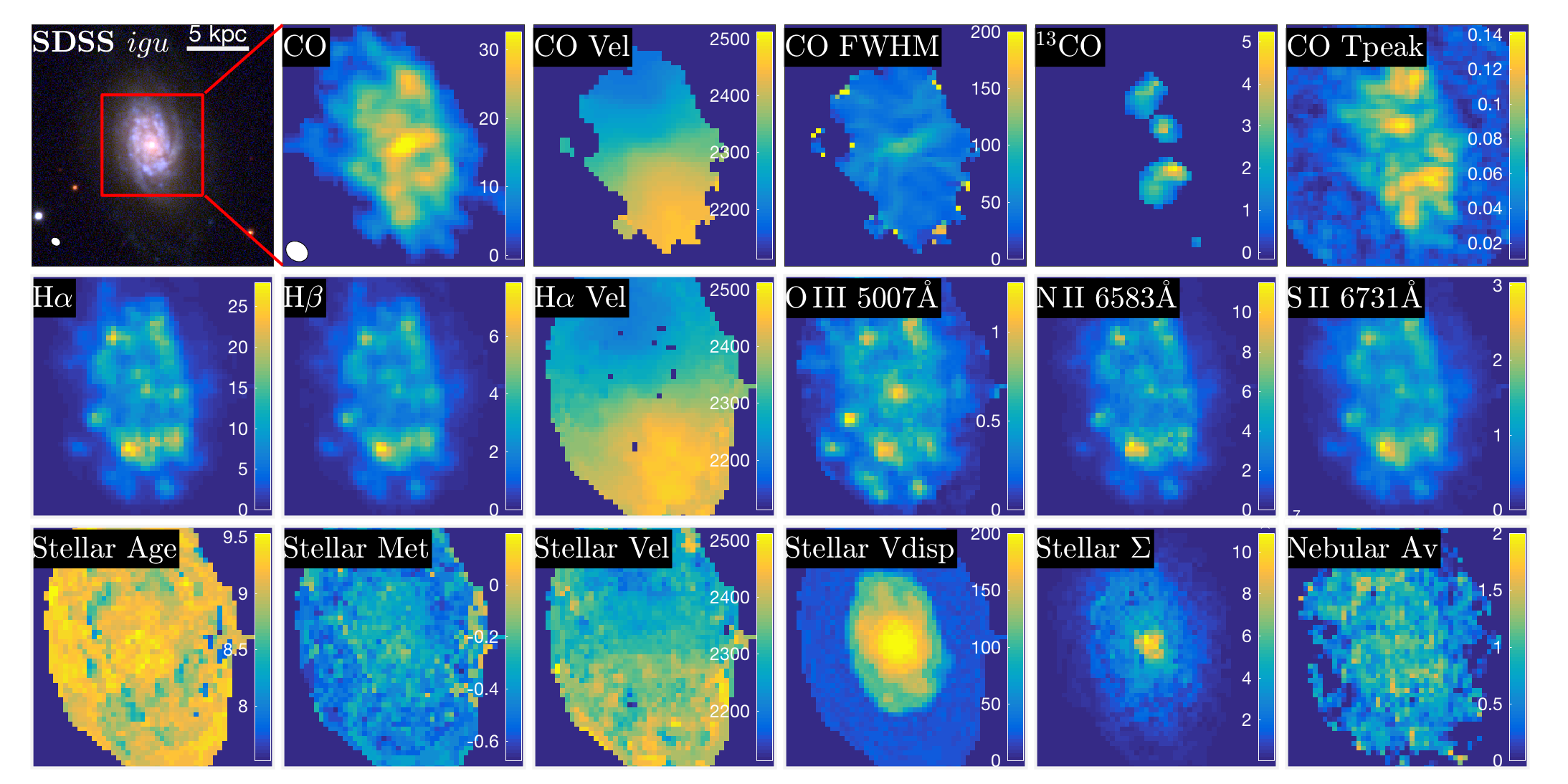 Example combined integral field spectrograph (IFS) and CO interferometric dataset for a galaxy, NGC5633 (from Bolatto et al. 2017). The first row are CO quantities, the second are example IFU quantities, the third are IFU derived quantities.