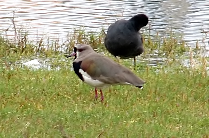 Southern Lapwing. At the pond, with a Common Moorhen in the background.