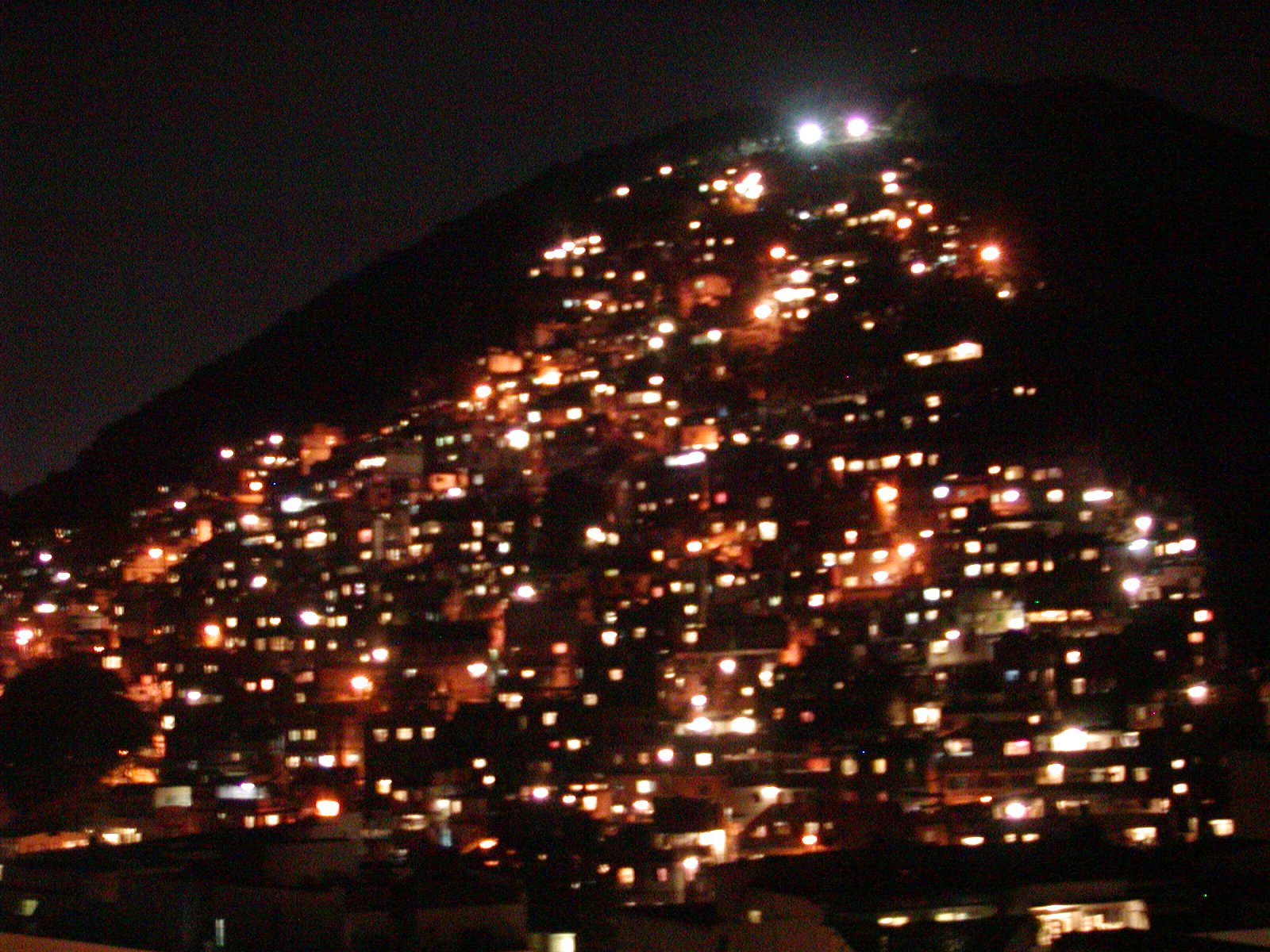 The poor districts of town, favelas, are on the hills. This is the view away from the beach, taken from the jacuzis on the roof of our four star hotel. Night is guilt-free.