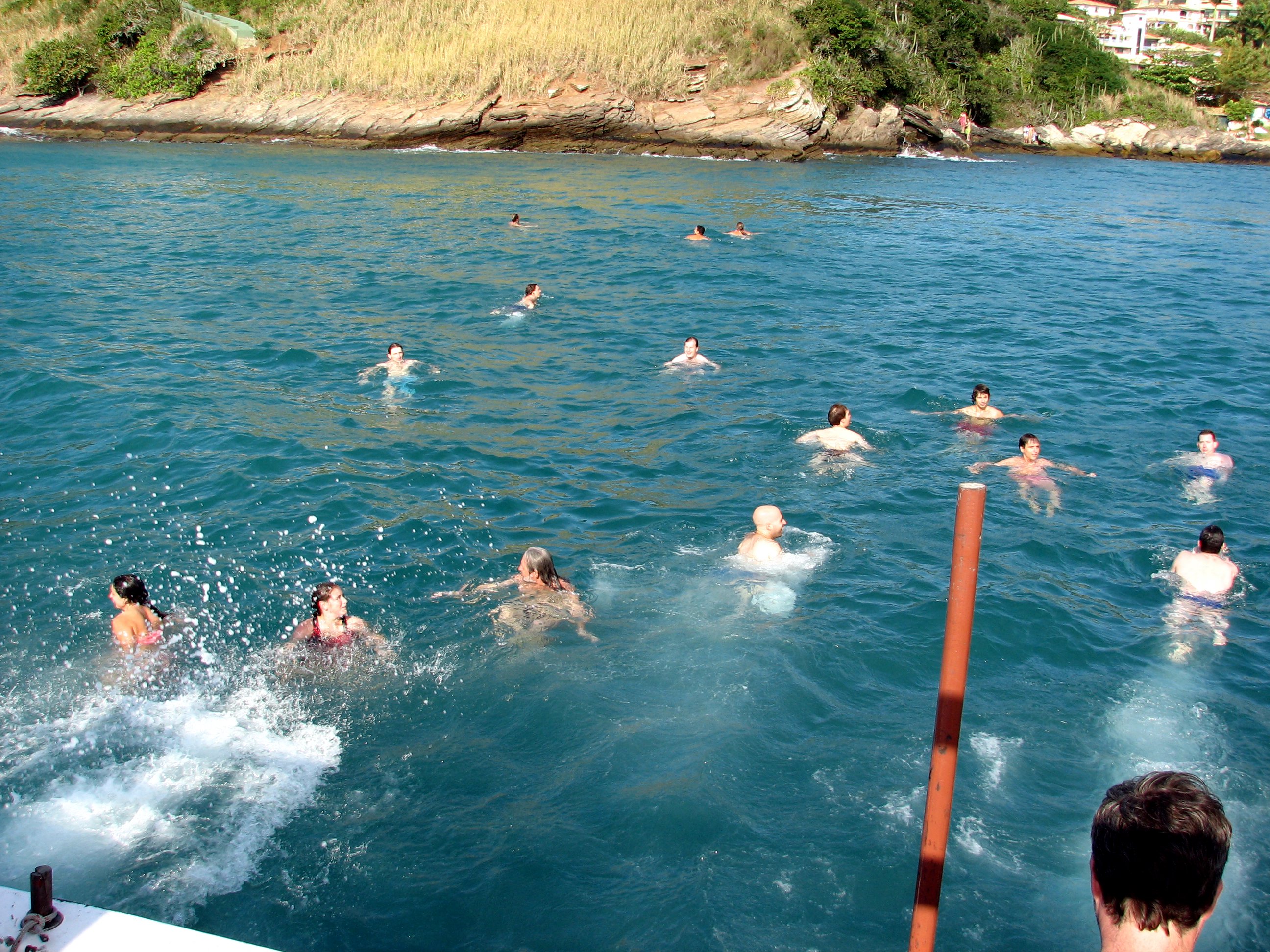 Astronomers swimming off the boat in chilly water at Ponta do Cavalo Ruco. To the right are the tiny, secluded Azedinha Beach and Azeda Beach.