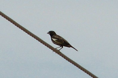 Lark Bunting (male, transitioning to non-breeding plumage). Life bird! Spotted it while cruising the rural roads near Denver International Airport, Aug 4/06.