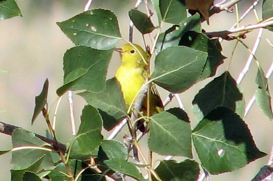 A Yellow Warbler peaks through the leaves of a bush at Cherry Creek State Park, Aug 4/06.