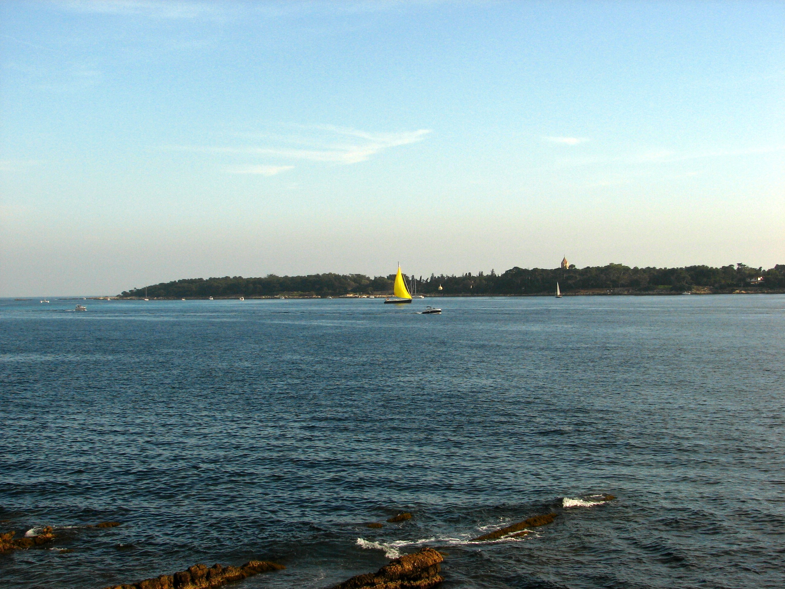 A colourful sailboat in front of the other island, St-Honorat.
