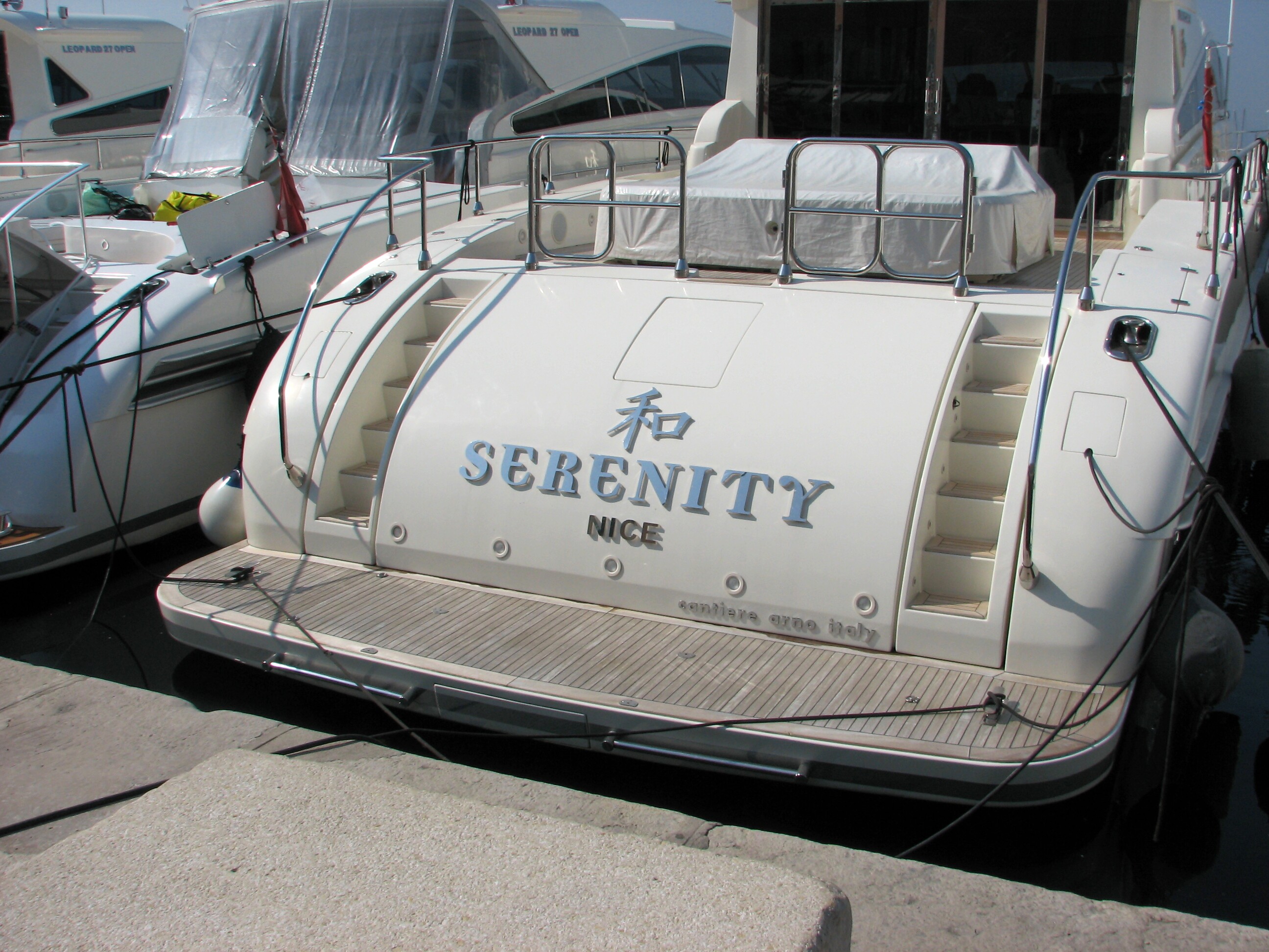 IMG_7294.JPG A boat with a surprising name moored in the (expensive!) St-Tropez harbour. The name and symbol on the stern of the boat refer to one of my favorite sci-fi series, Firefly, and the movie, Serenity. I'm told by an expert that the symbol is Chinese for "unity," and that when combined with other characters it could mean "peace" or "togetherness." |
