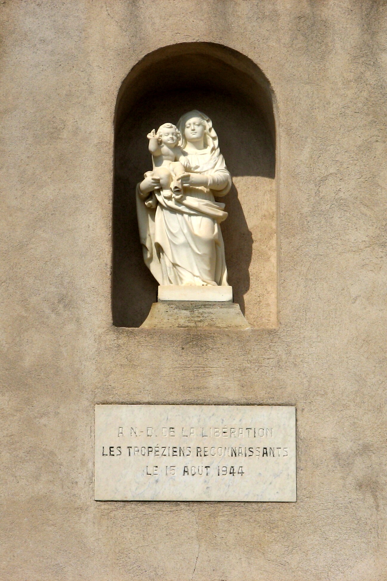 A statue and inscription on Ste-Anne's Chapel (St-Tropez) commemorating the liberation of the area by the United States during World War II.
