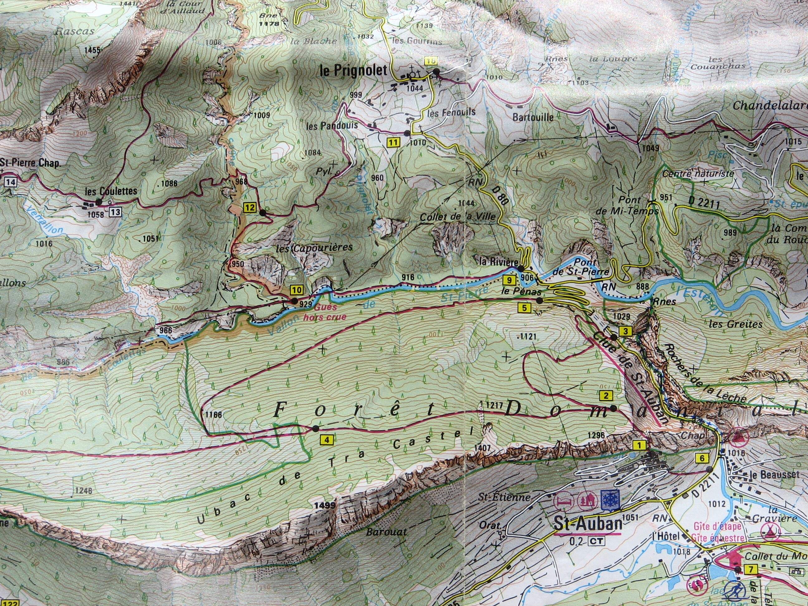 IMG_7428.JPG The next day (3/25/07) I went on a solo expedition to find a Golden Eagle nest (and hopefully some Golden Eagles!). On the map, I drove to le Prignolet near the top, parked south of les Pandouis (near the spot marked "Pyl." on the map, a communication tower), and hiked west to les Coulettes and beyond, to the base of a steep cliff, where I found the nest, but alas no eagles. |