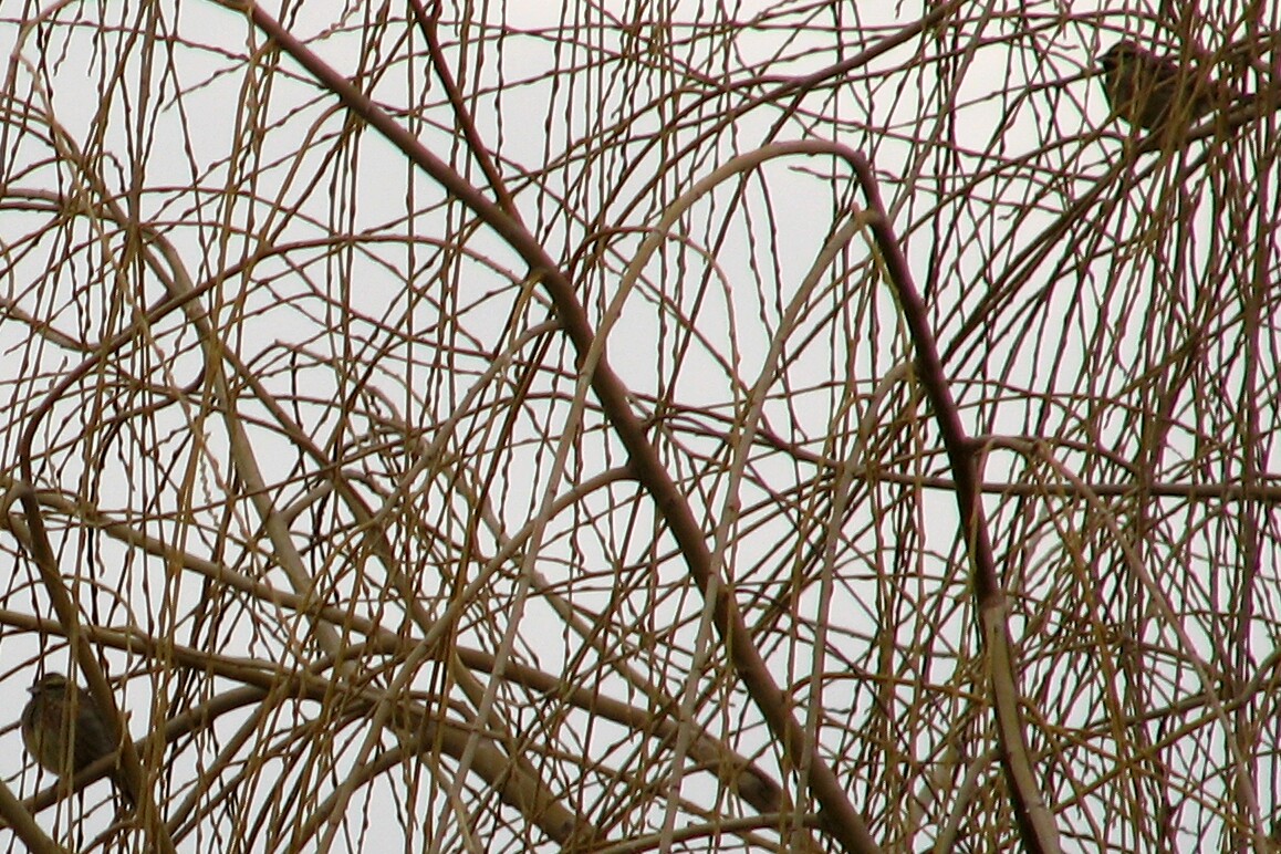 Cirl Bunting. Lake Urbino, Corsica, 2/7/07. Two individuals barely identifiable through the branches. Notice the dark eyeline and throat.