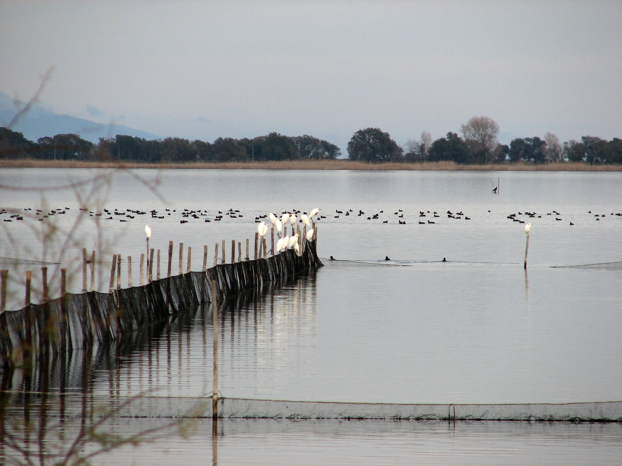 Little Egrets and Eurasian Coots. Lake Biguglia, Corsica, 2/8/07.