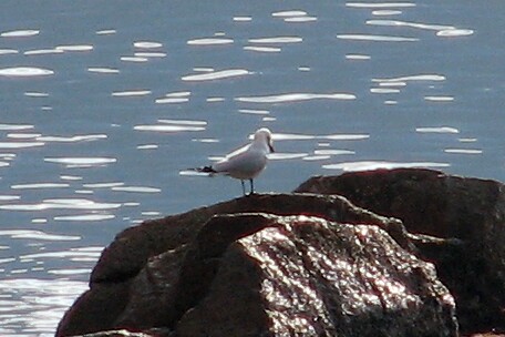 Gull,Audouins01.jpg Audouin's Gull. Bussaglia beach, Corsica, 2/4/07. We were amazed to find this life bird standing on its own, with no other birds around (apart from some distant cormorants/shags). My field guide describes this species as "one of the world's rarest gulls" but also says there has been a "significant increase in [the Western] Mediterranean in recent years." The key fieldmarks, easily seen by this obliging gull (it stayed for at least 10 minutes), include the dark legs and bill (to distinguish it from Yellow-legged Gull, the only other large gull expected), dark eye, and pale back. |