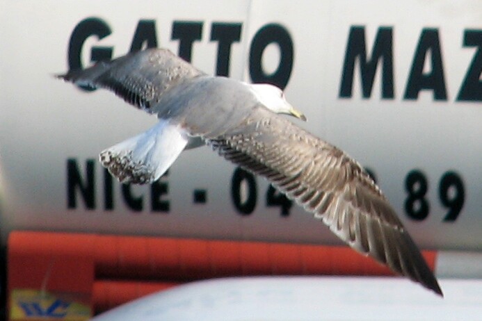 Gull,Yellow-legged06.jpg Yellow-legged Gull (juvenile). Nice, 2/3/07. Seen from the ferry as we were leaving port. Note the pale tail-base with black terminal band, useful in distinguishing this species in juvenile plumage.