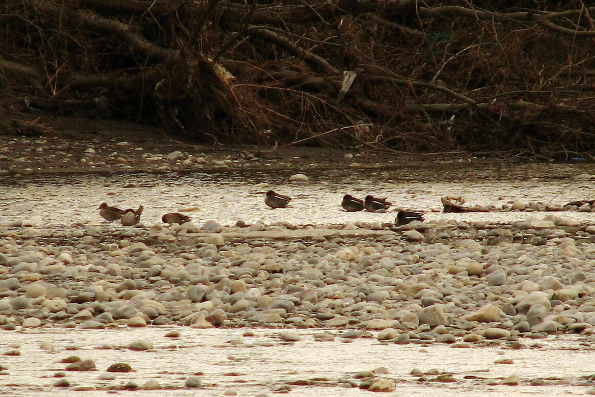 Teal,Green-winged01.jpg Green-winged Teal (male and female). Var River mouth, St-Laurent-du-Var, 1/31/07. The Eurasian variety (note the horizontal white mark on the sides) of the familiar teal of North America.