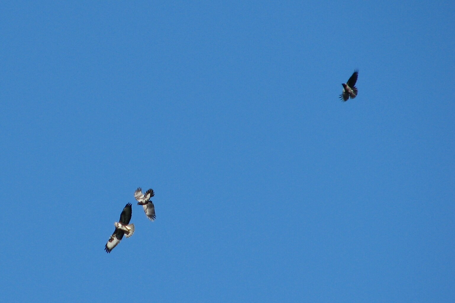 Hooded Crows attacking a Common Buzzard. Near Ajaccio, Corsica, 2/5/07. Watch the movie!