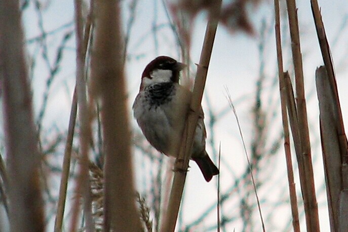 IMG_6646.JPG Italian Sparrow (male). Near Lake Urbino, Corsica, 2/7/07. It looks like a House Sparrow, but this hybrid has characteristics of Spanish Sparrow: all-white cheek (not gray) and a rufuous (again, not gray) cap. Alas, we didn't see any pure Spanish Sparrows. |