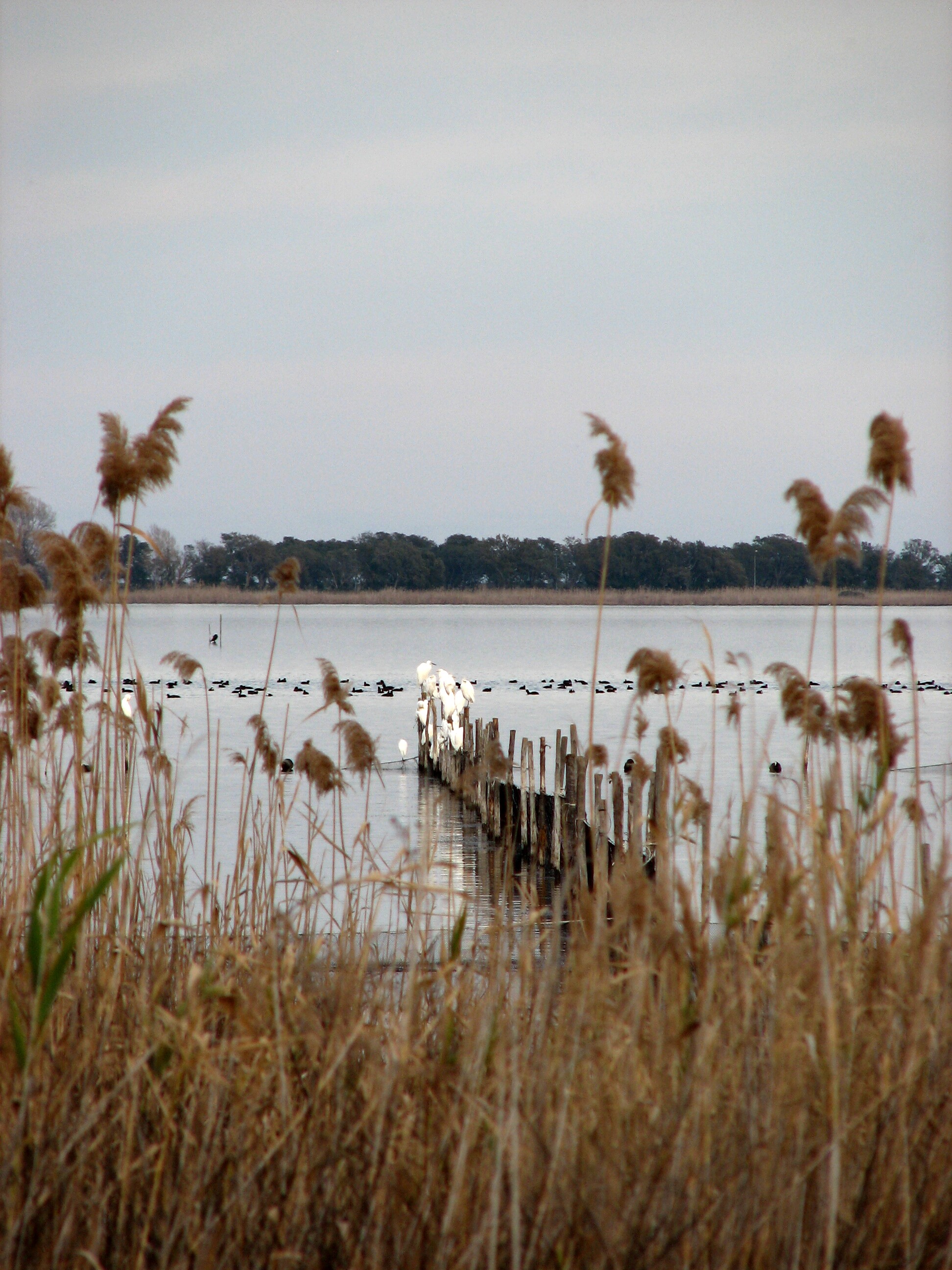 Little Egrets and Eurasian Coots. Lake Biguglia, Corsica, 2/8/07. We found Moustached Warbler and Cetti's Warbler in the reeds around here.