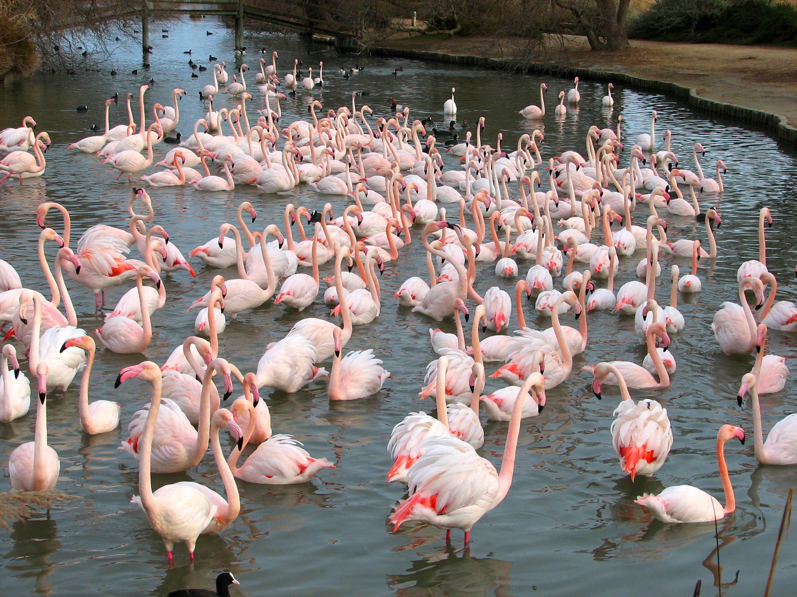 IMG_7188.JPG Greater Flamingo. Ornithological Park, Camargue, 2/11/07. Also visible are Eurasian Coots, Common Shelduck, and Common Pochard. You can see how close the birds allow you to get -- amazing!