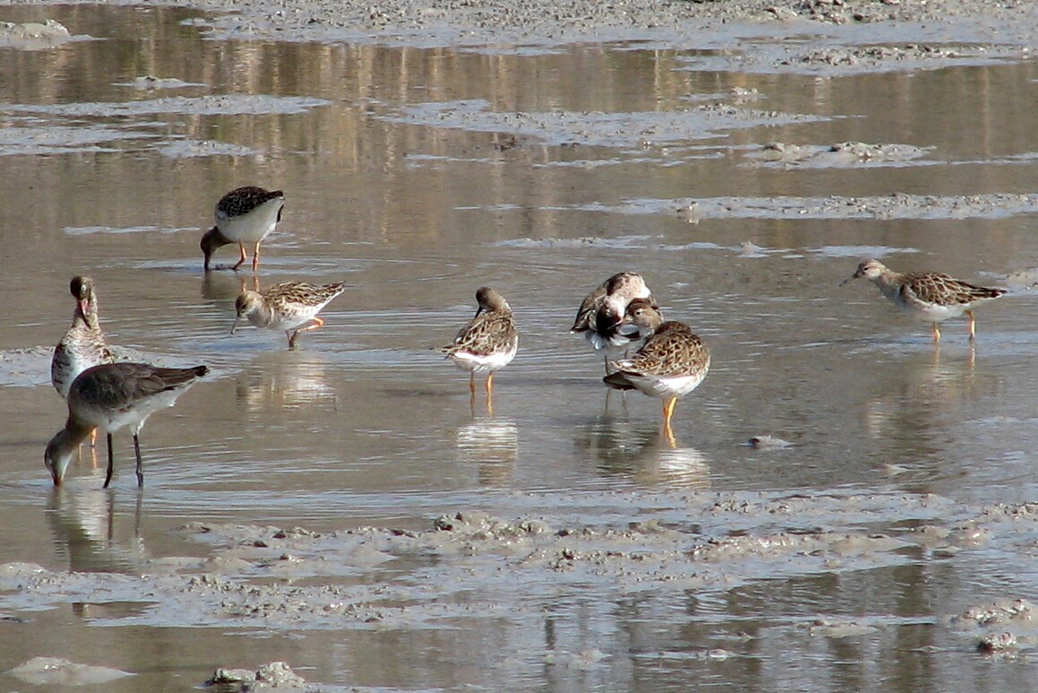 Shorebirds. La Capelière, Camargue, 3/28/07. Can you spot the Black-tailed Godwit among the Ruff?
