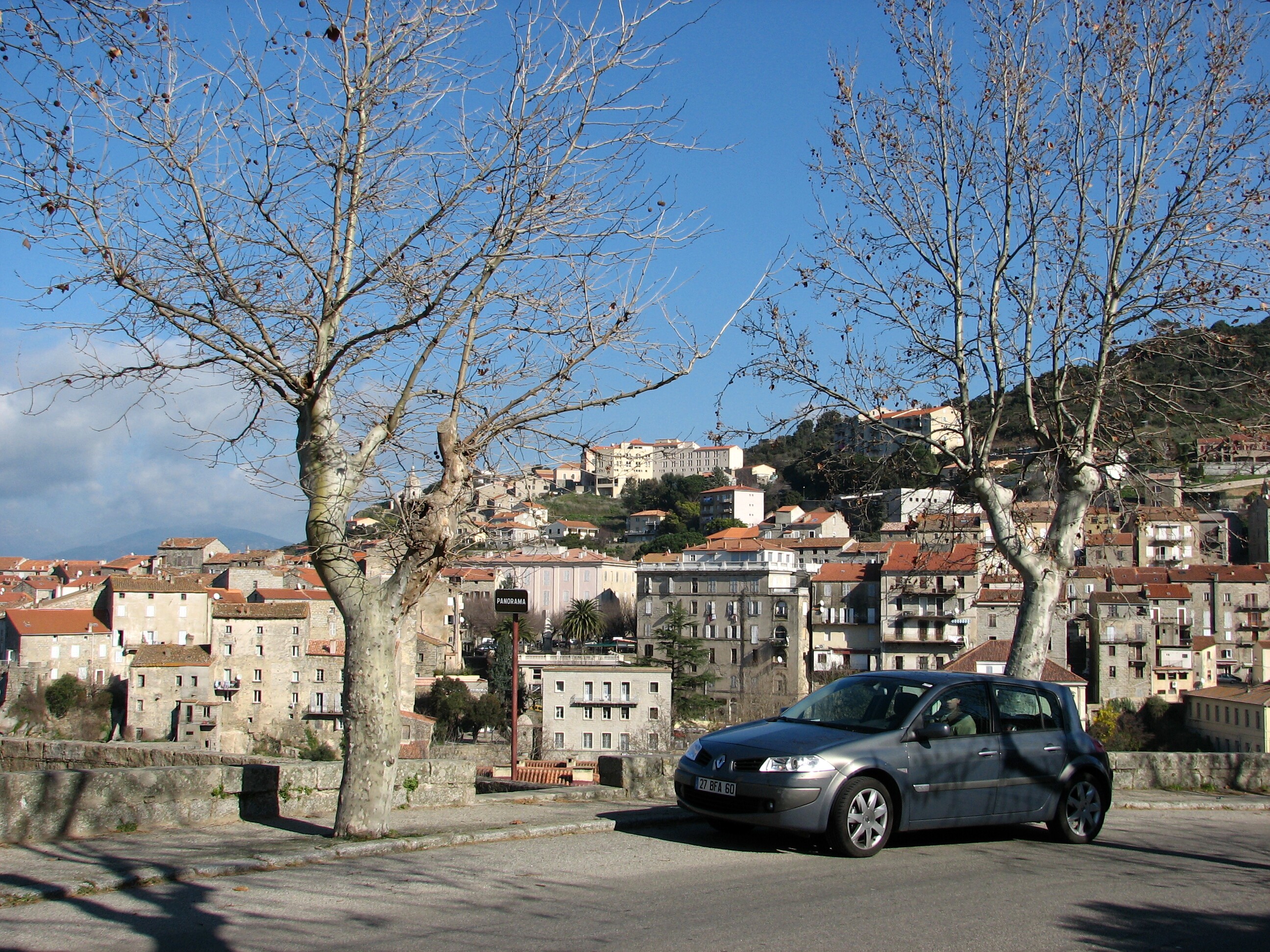 Another view of Sartène, and of our car! (It's a Renault.)
