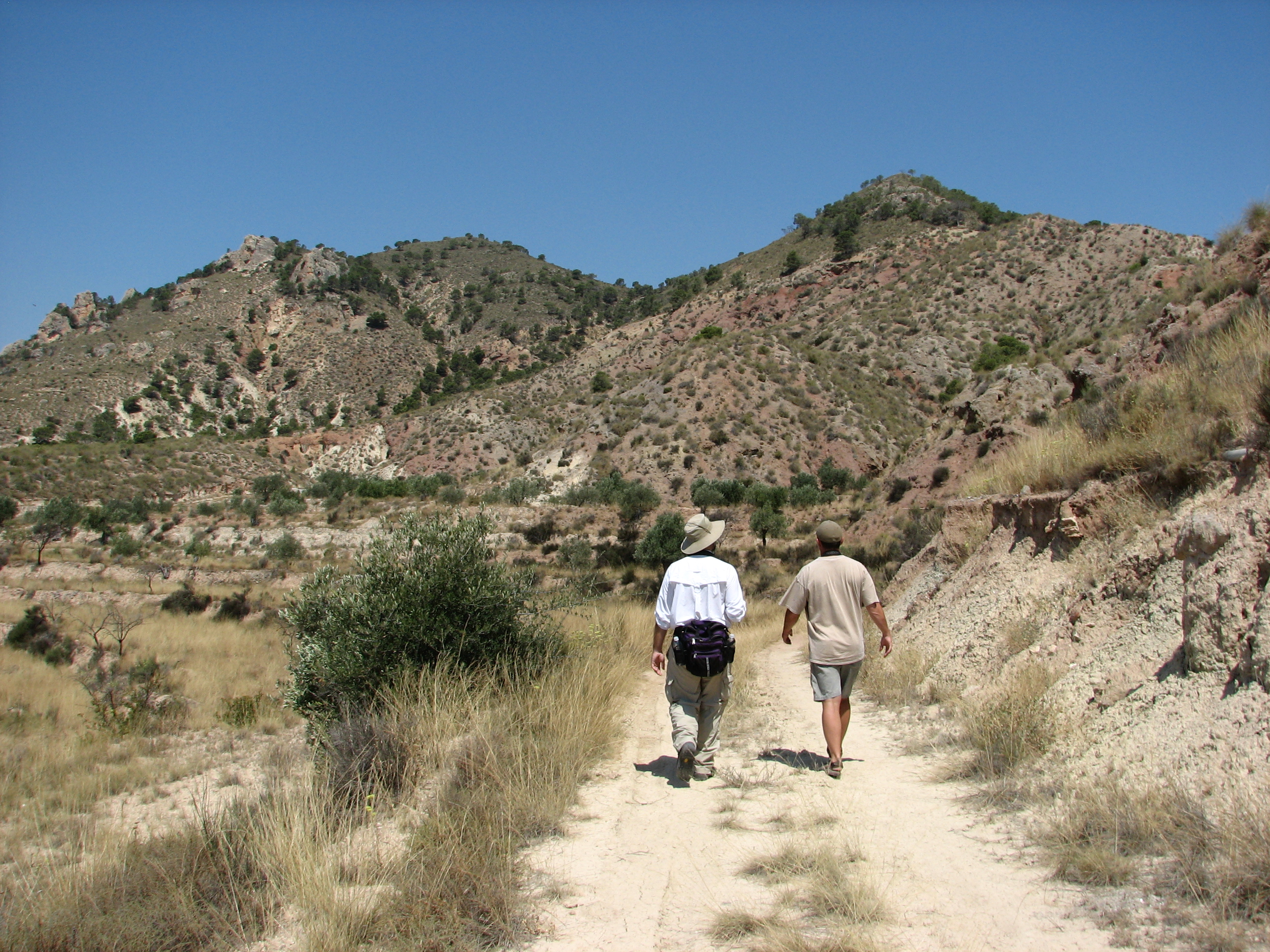 6/30/07, Montnegre (near Alicante). Nice arid landscape. That's Lance on the left and our guide Jules on the right. We saw our first Black Wheatears just ahead.