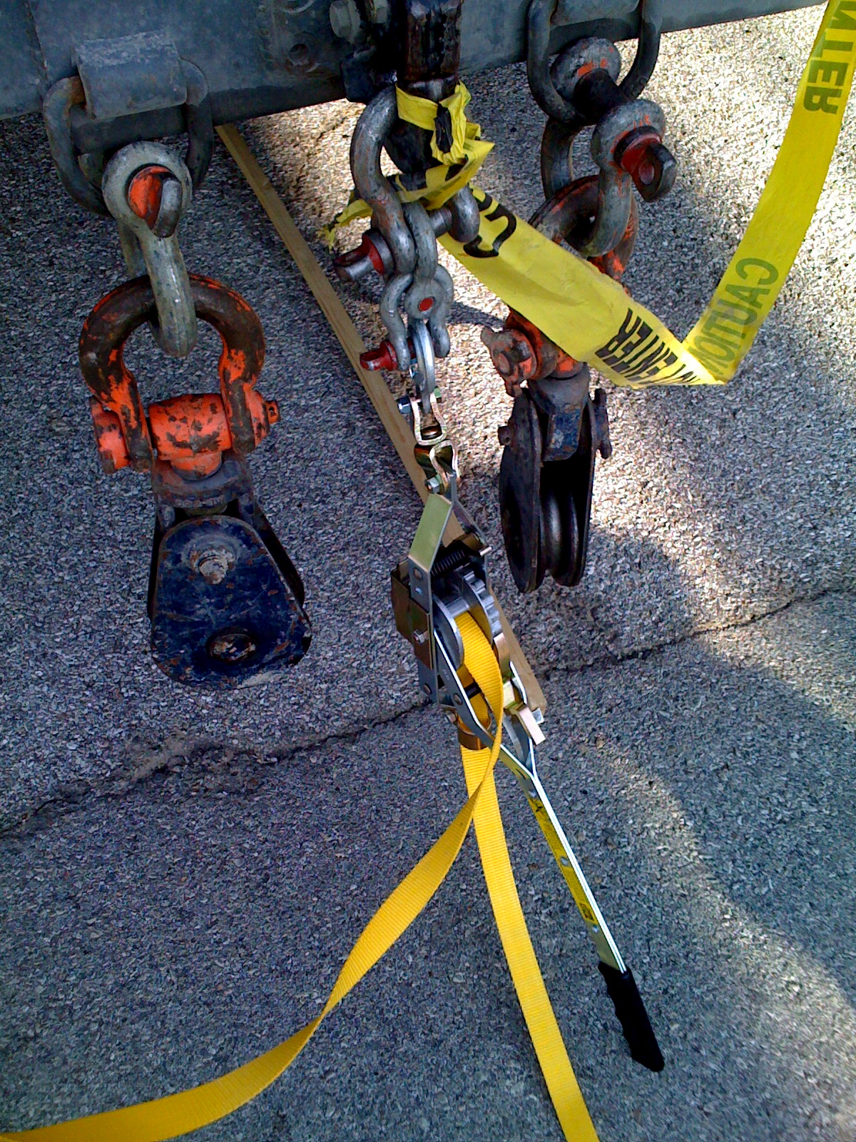 Today we wanted to try a racheting mechanism to allow us to pull the balls further apart. Here's part of the rigging on A-Ray's crane.