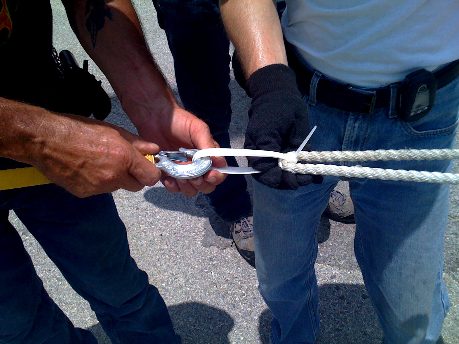 We quickly discovered that the rated 175 lbs tensile strength of the tie is not enough, so we simply looped it twice! This worked great.