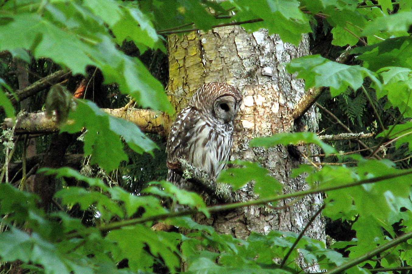 Barred Owl, Skookum B&B, Sooke, May 24/07. The owl was mobbed by crows and a robin.