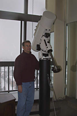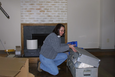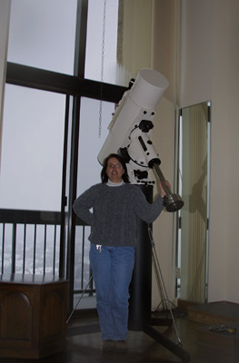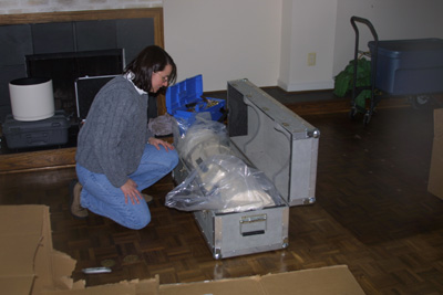 ![]() Elizabeth starts to open the box. The box is deceptively small. It was heavy and we were wondering what else had been packed in there! The second shock was when it arrived and we tried to set it up for the first time. This scope was heavy! Although shorter in length than our AP refractor, it was far heavier. It took the two of us to set it up on the pier and mount. Of course, we quickly realized that the pier for the refractor was way too high for the mak-newt. So we had to get a new shorter pier. |