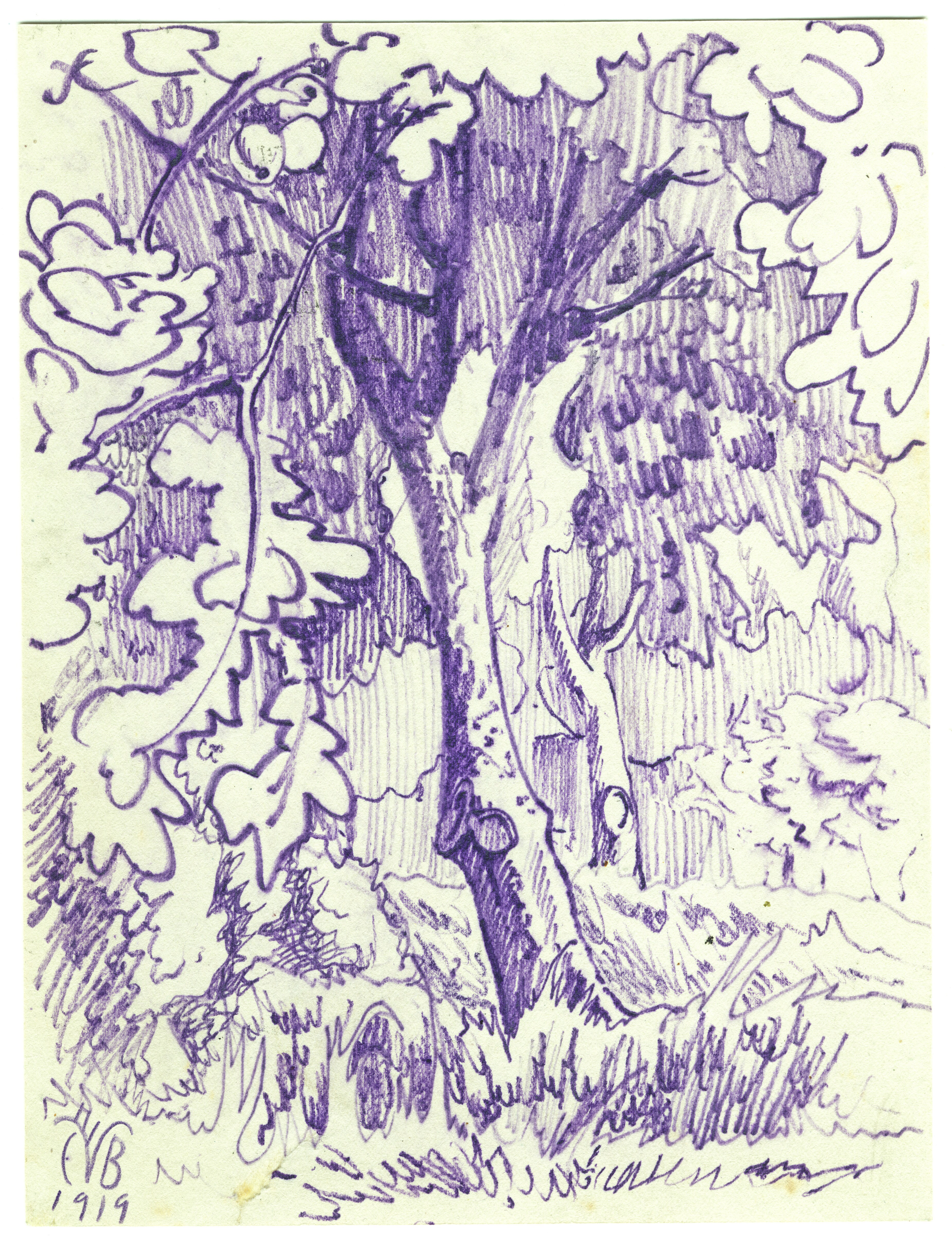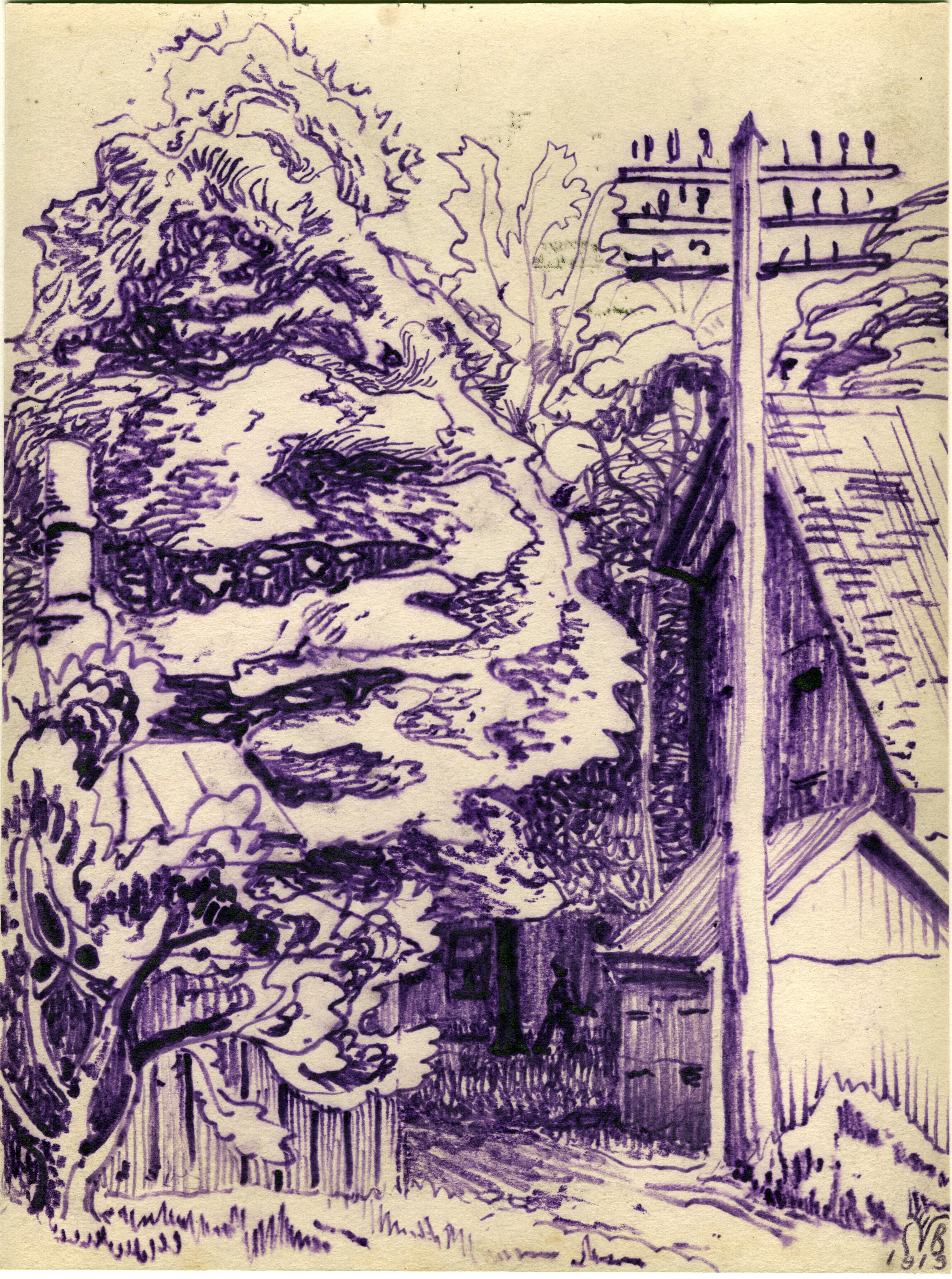 Burchfield first did a series of drawings in violet indelible pencil as a sort