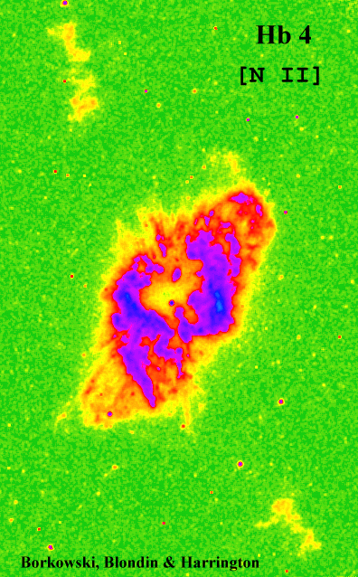 Hb 4, also in H-alpha and [N II]. We targeted this nebula because of the two outlying radial segments seen in the CCD images of Schwarz, Corradi & Melnick (1992). The HST images show how complex these features really are. The [N II] image of the northern segment, in particular, shows a distinct "corkscrew" structure. The southern segment may have a similar structure, but it is harder to trace. Also note that in the H-alpha image, the southern segment is in line with the "nipple" in the faint arc of nebulosity outside the bright core. A paper by Lopez, Steffen & Meaburn (1997) finds that the corkscrew segments have velocities of +/- 150 km/sec. A new study has just appeared in preprint "High velocity string of knots in the outburst of the Planetary Nebula Hb4" by Derlopa, S. Akras, P. Boumis, and W. Steffen (arXiv:1901.05767).