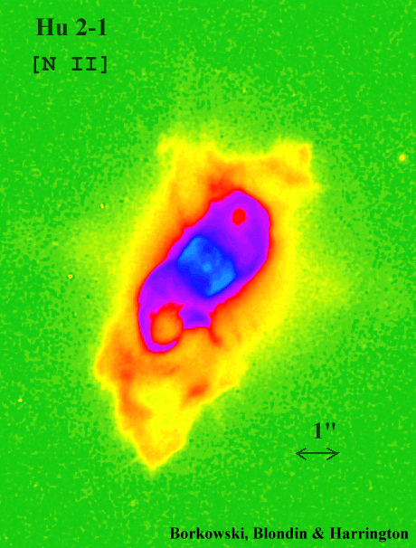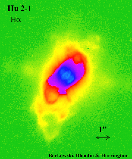 Hu 2-1 in H-alpha and in [N II]. The innermost ring seen in H-alpha, with a major axis of 0.7", was observed with the HST PC by Bobrowski (1996). The [N II] image, on the other hand, seems to show a cylindrical cavity which opens into a bi-lobal structure. In our deeper images, one can see how the axis of the nebular structure twists counterclockwise as we progress outward.