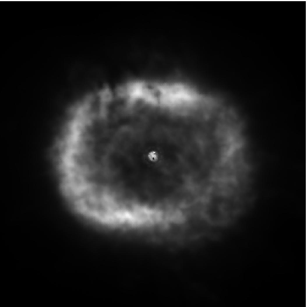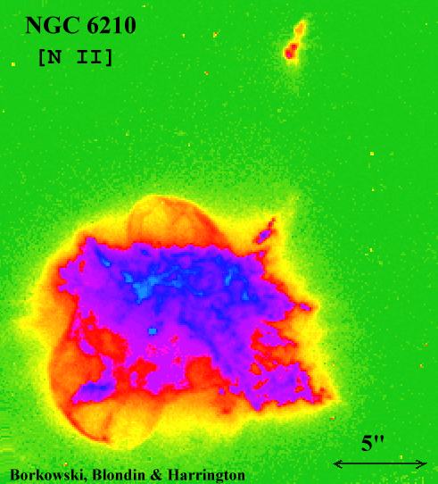 NGC 6210. This is an HST WF2 Image in [N II]. While the bright parts of this nebula are chaotic and very asymmetrically placed with respect to the central star, there is also a fainter, symmetric, two-lobed bubble. Along the axis of this bubble 17" to the northeast of the star, is an elongated "bullet". This bullet is actually the brightest part of one of the pair of point symmetric "arms" that can be seen in a deep CCD image by Balick et al. (1992).