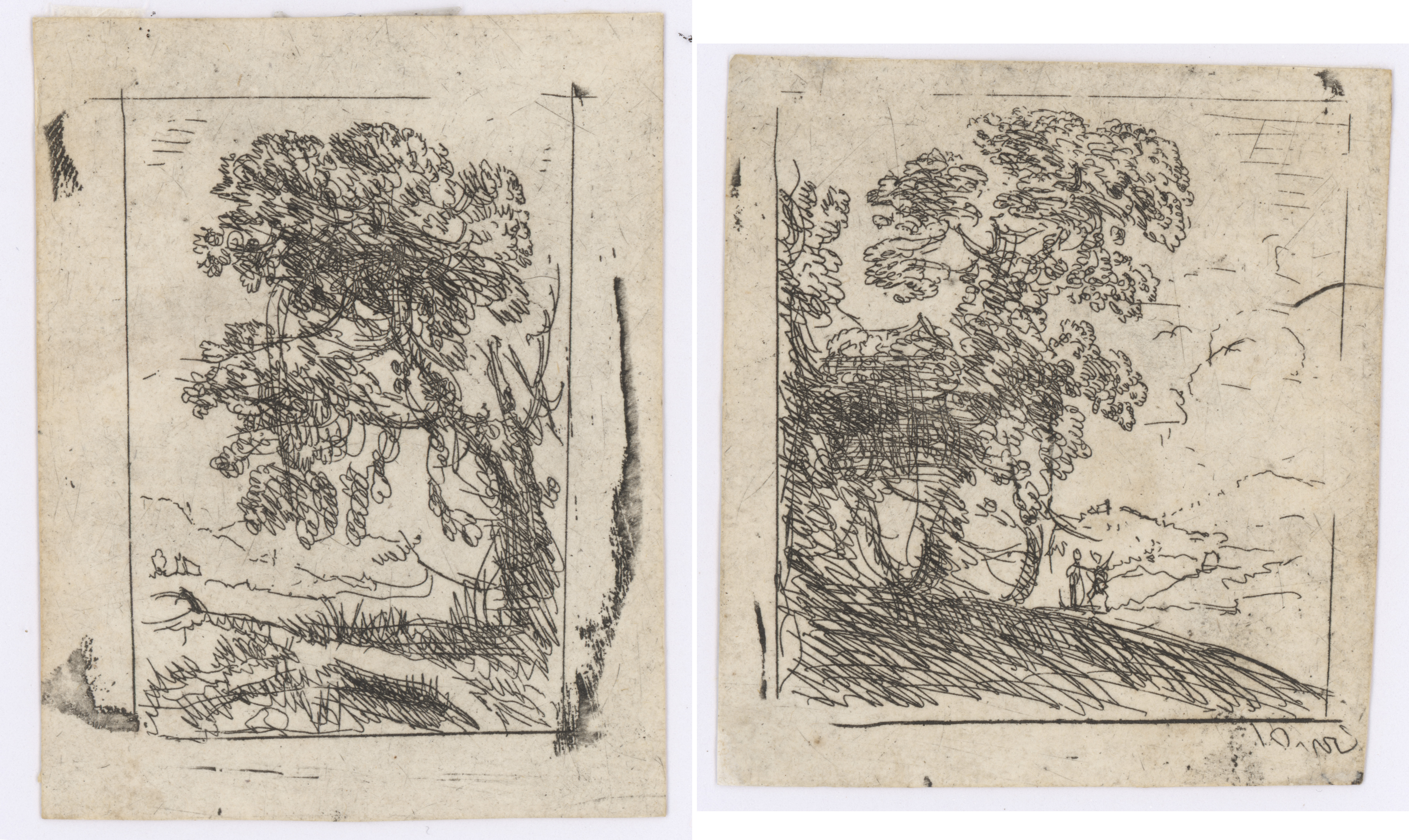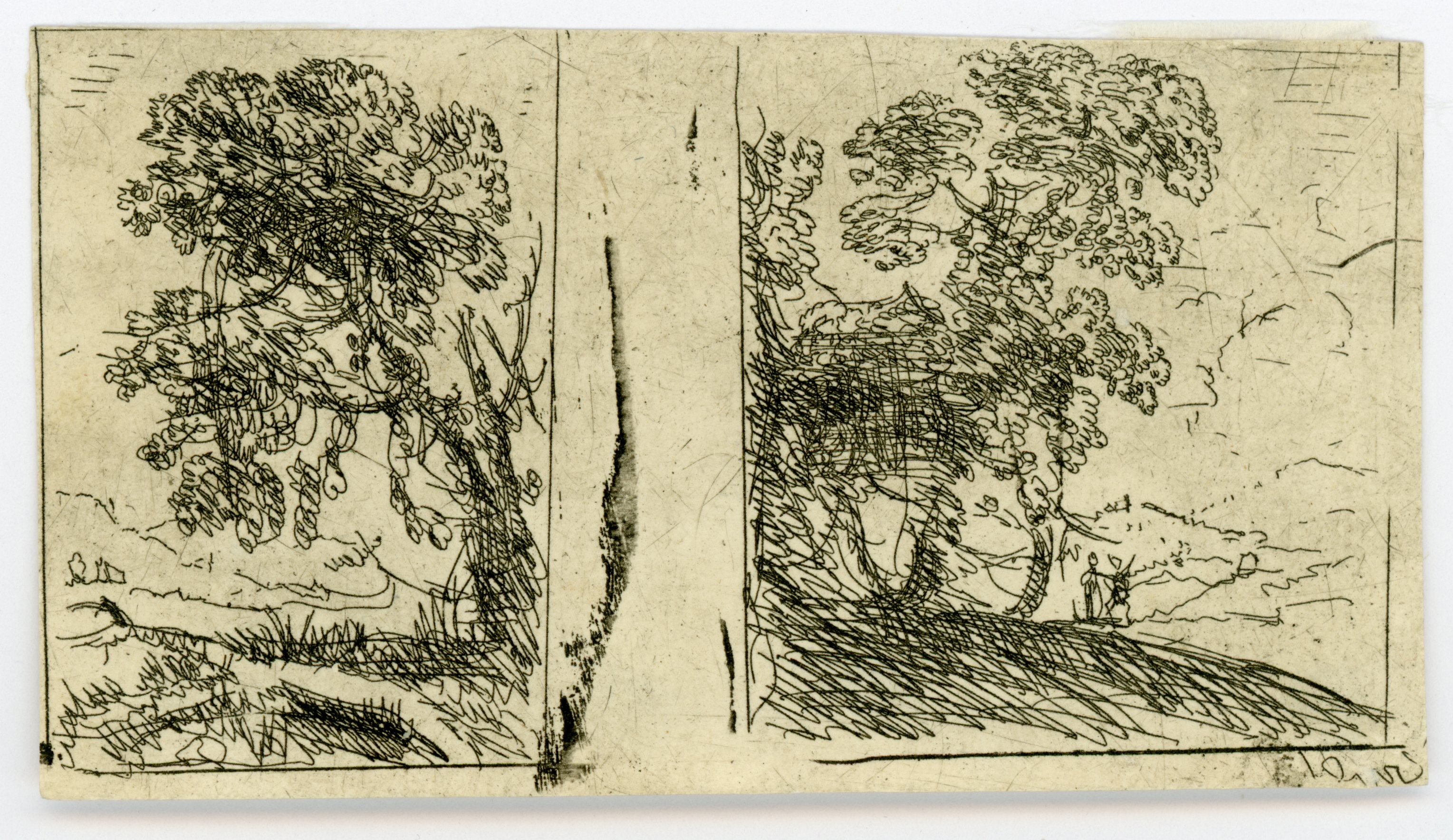 These are not proper etchings but, clearly, just from a test plate to judge the strength of the acid. Nevertheless, it shows how Claude could evoke a landscape with a few scribbled lines. Mannocci notes that the smudge in the upper left is likely Claude's fingerprint!
