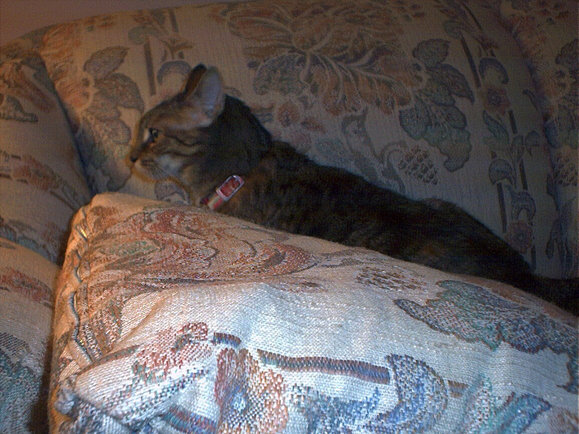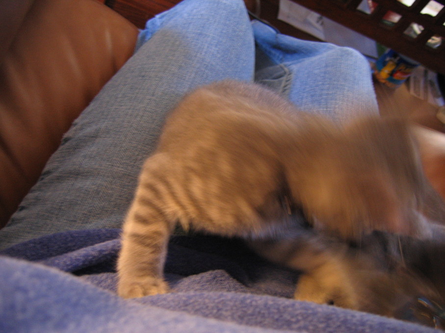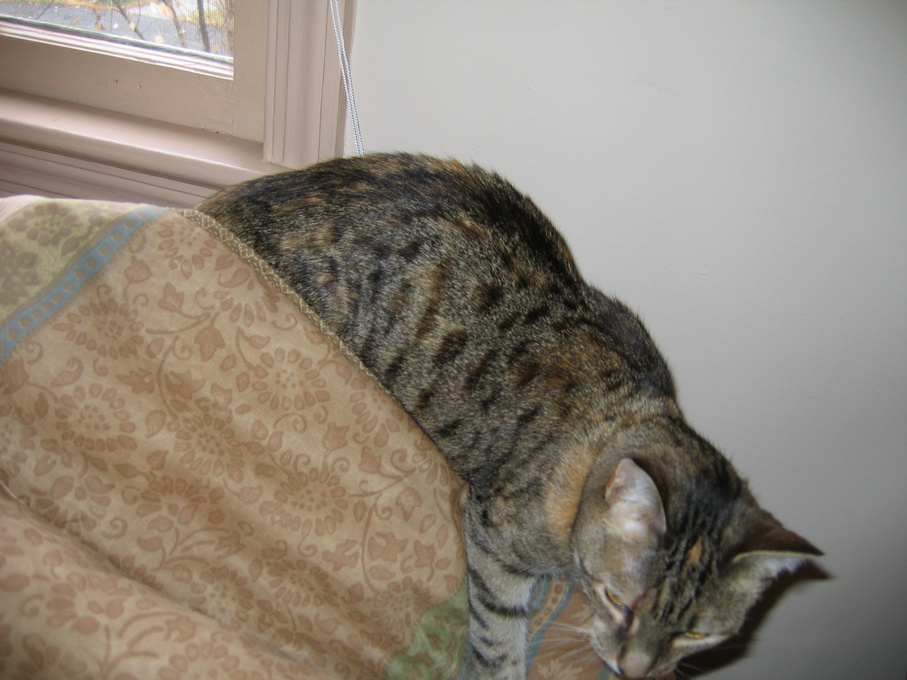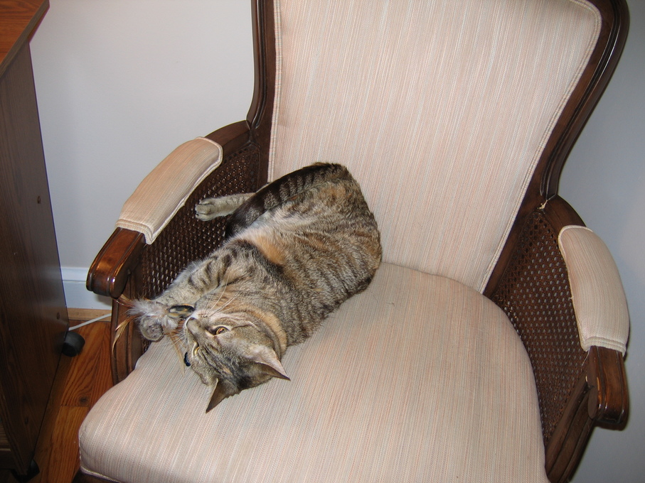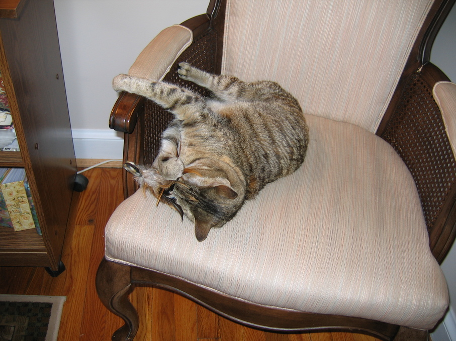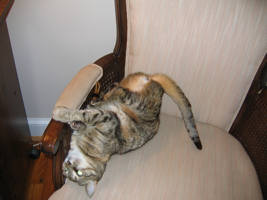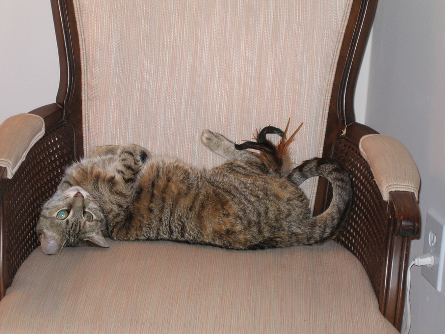 Electra being frisky on the chair arm.