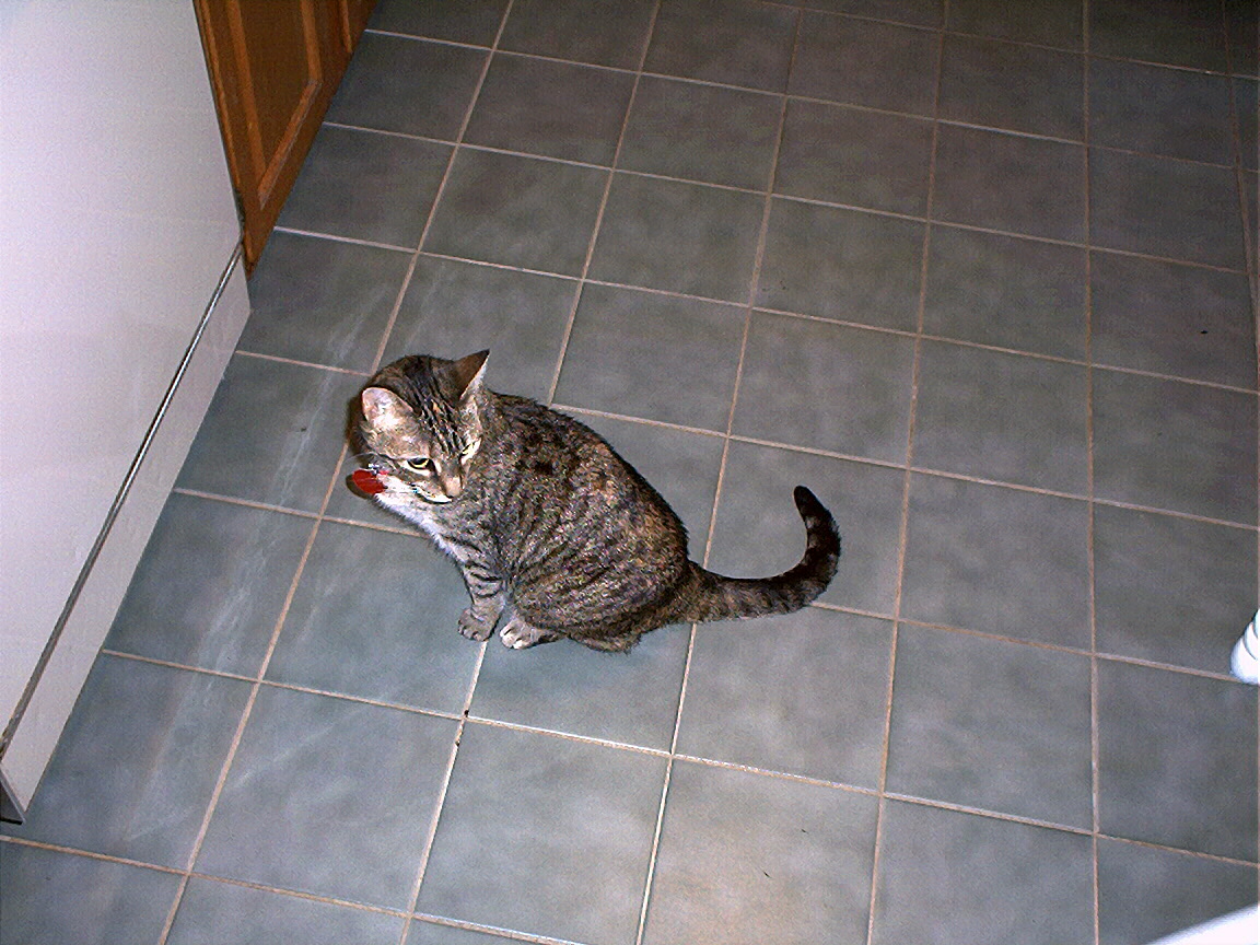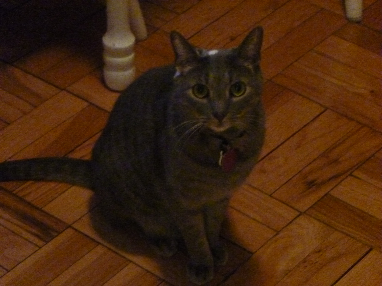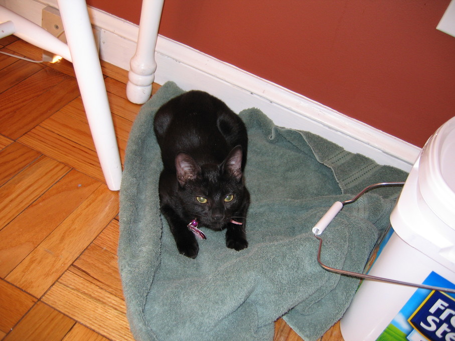 Electra sitting on the heater in the basement