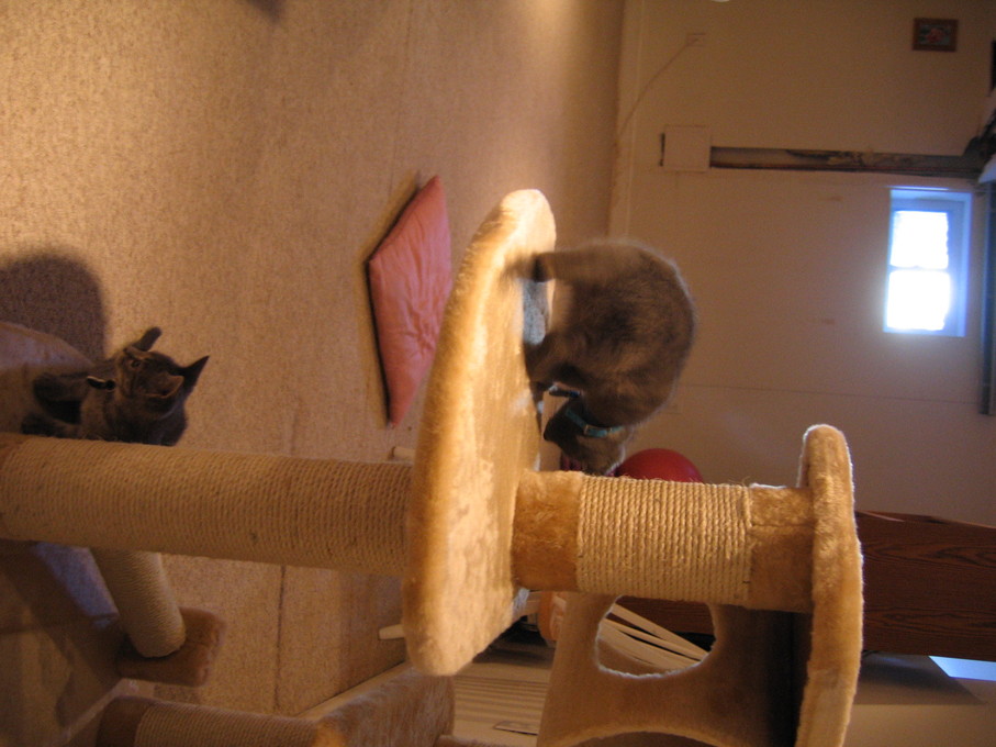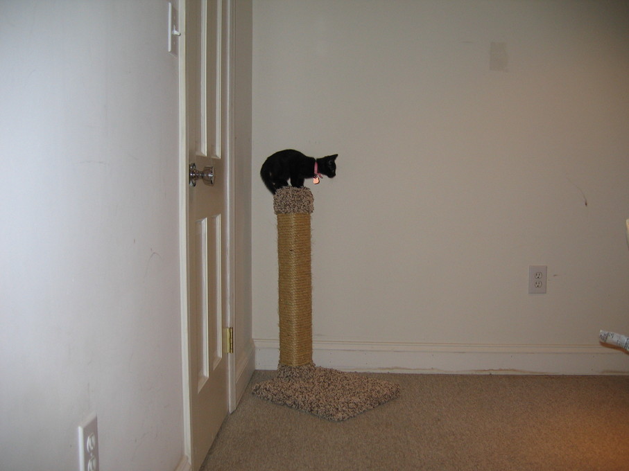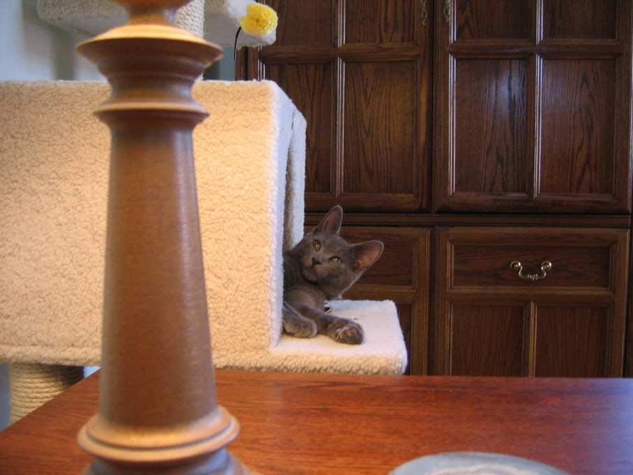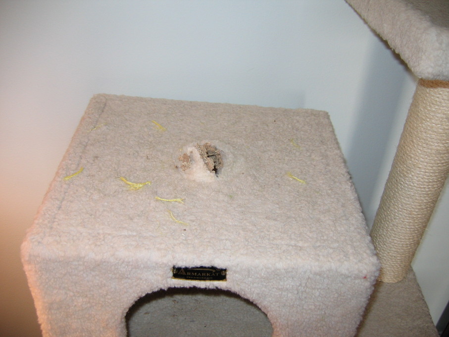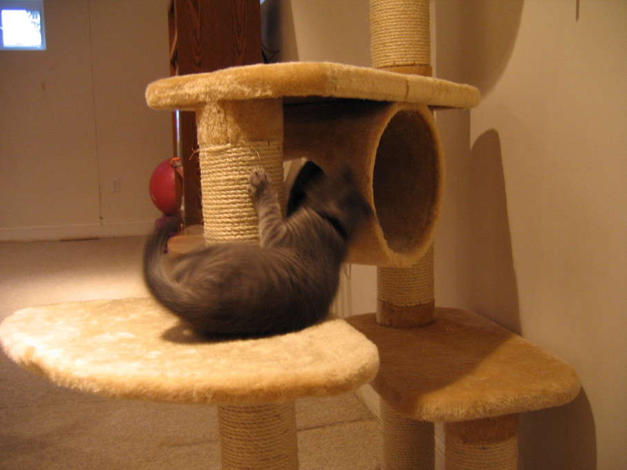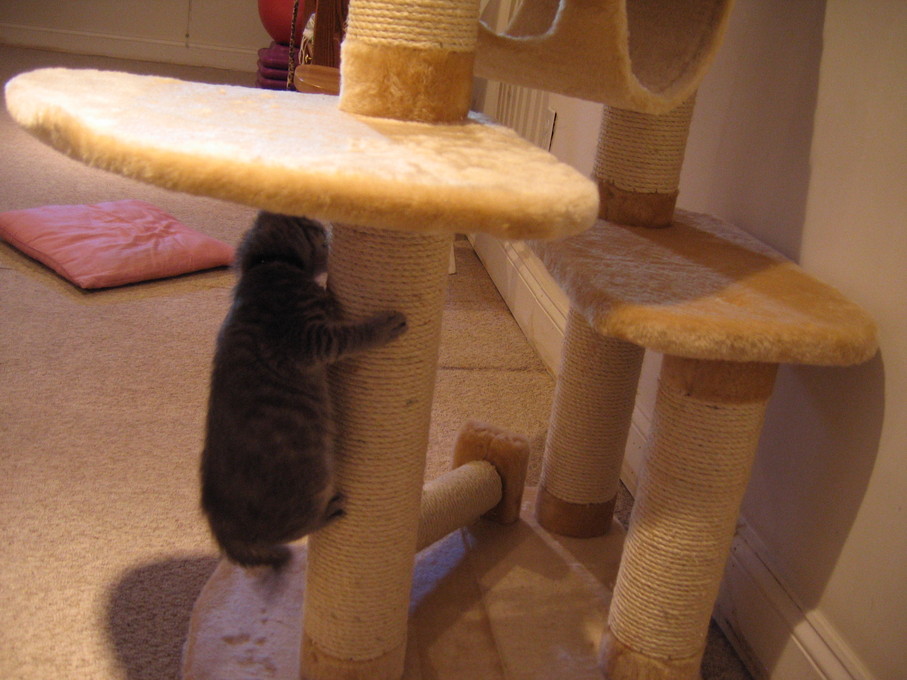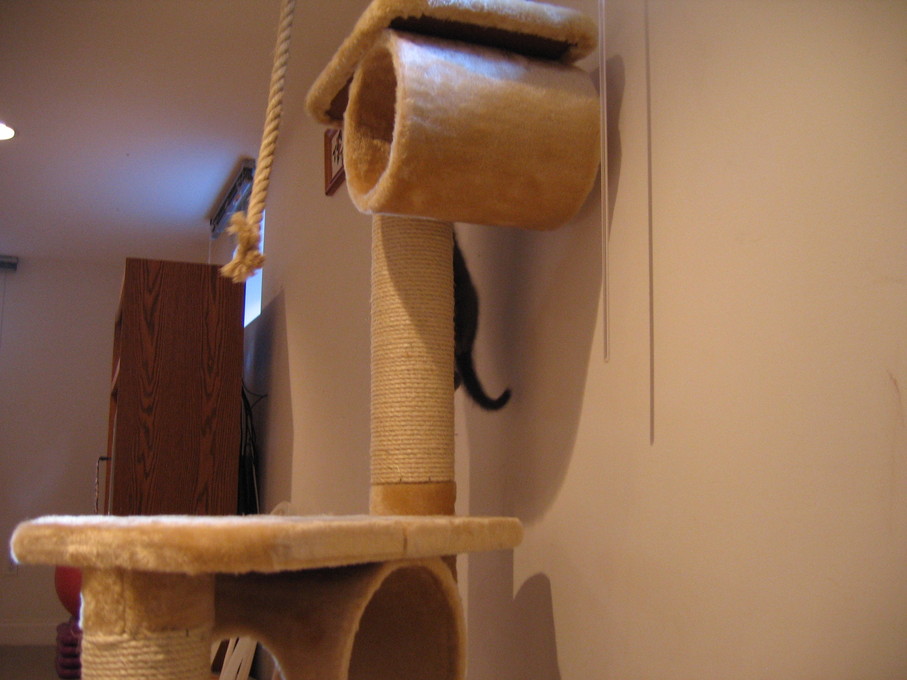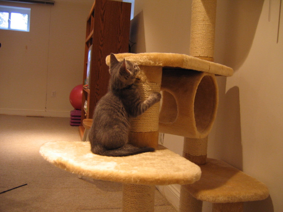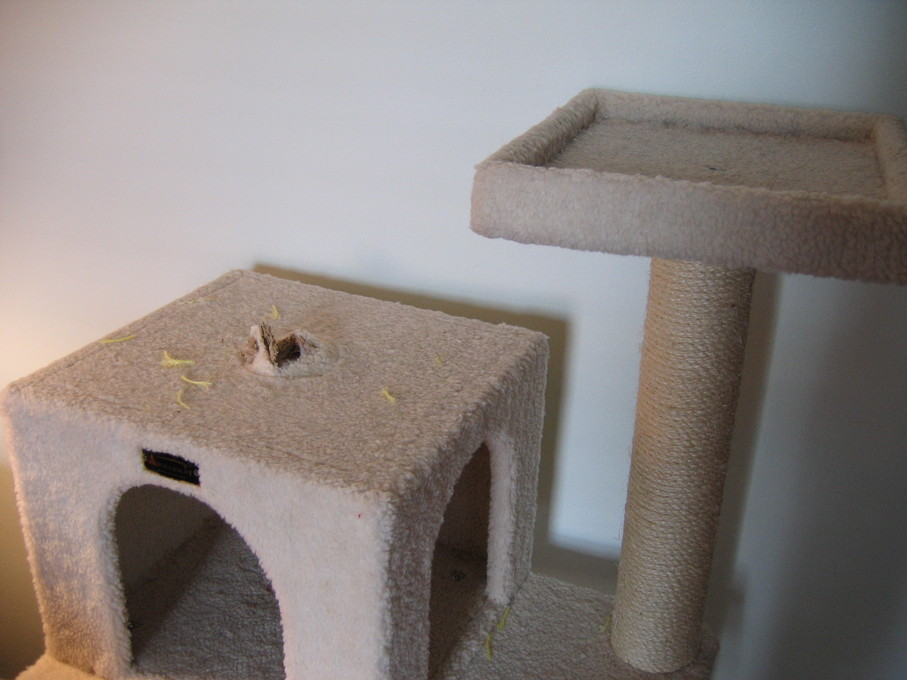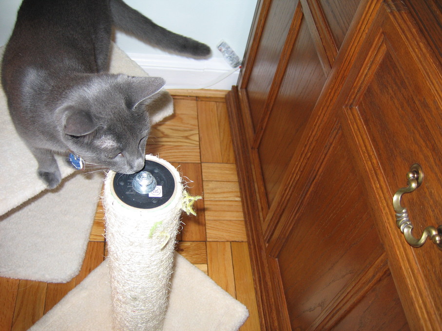 Zathras examining the part of the cat tower that broke off.