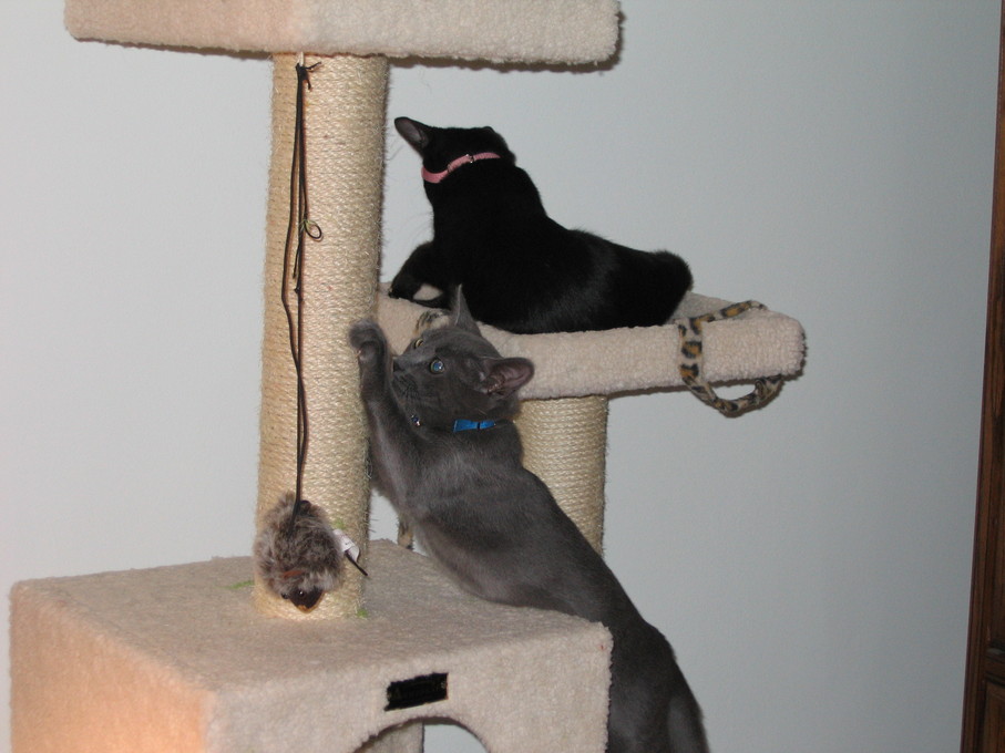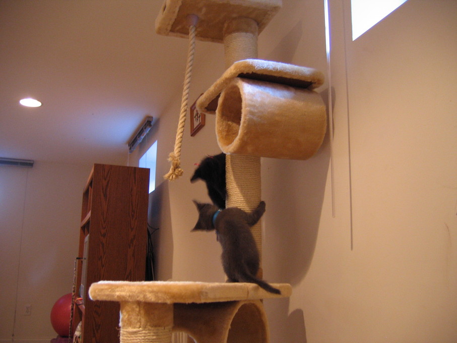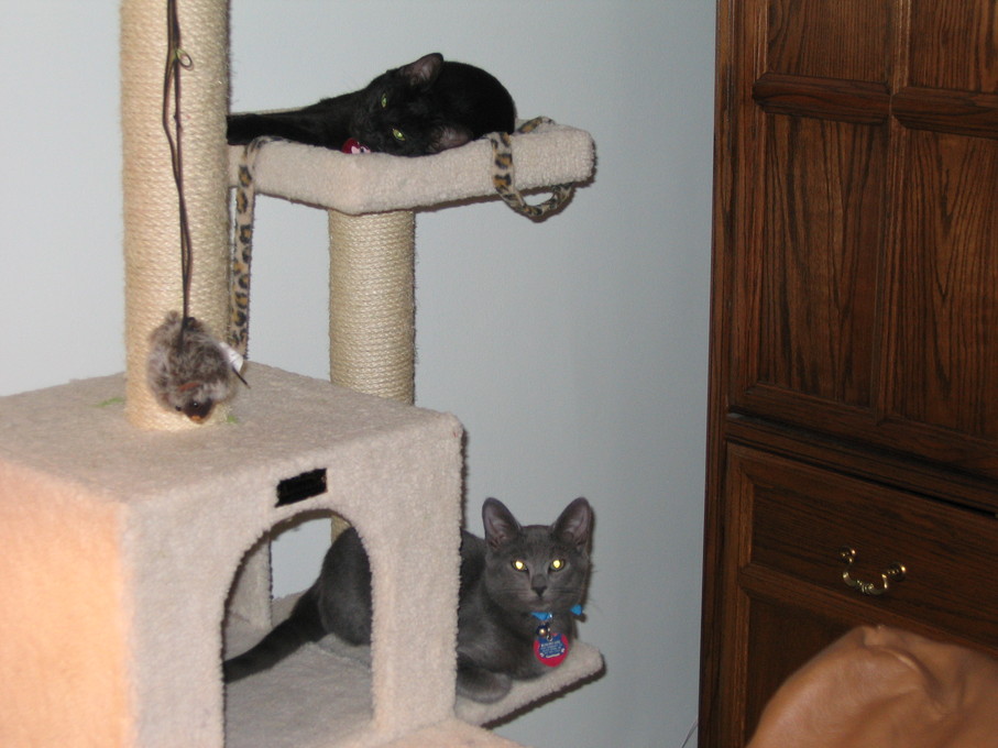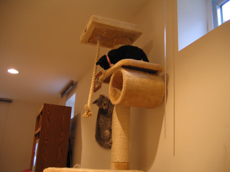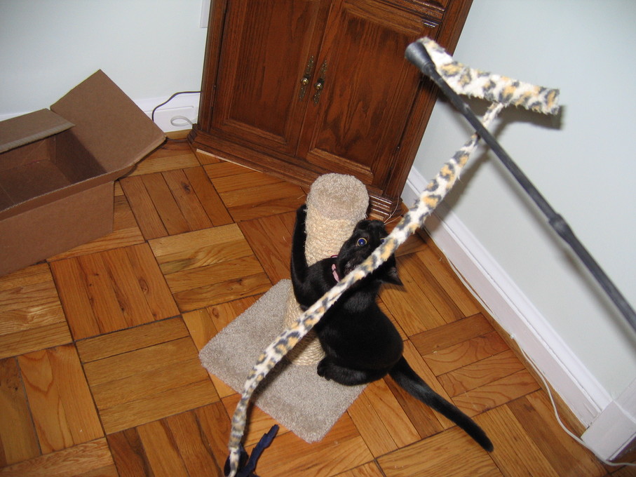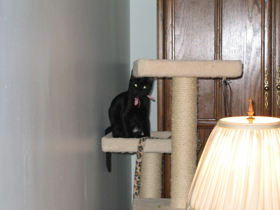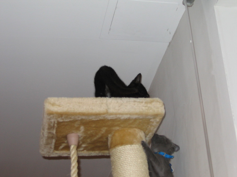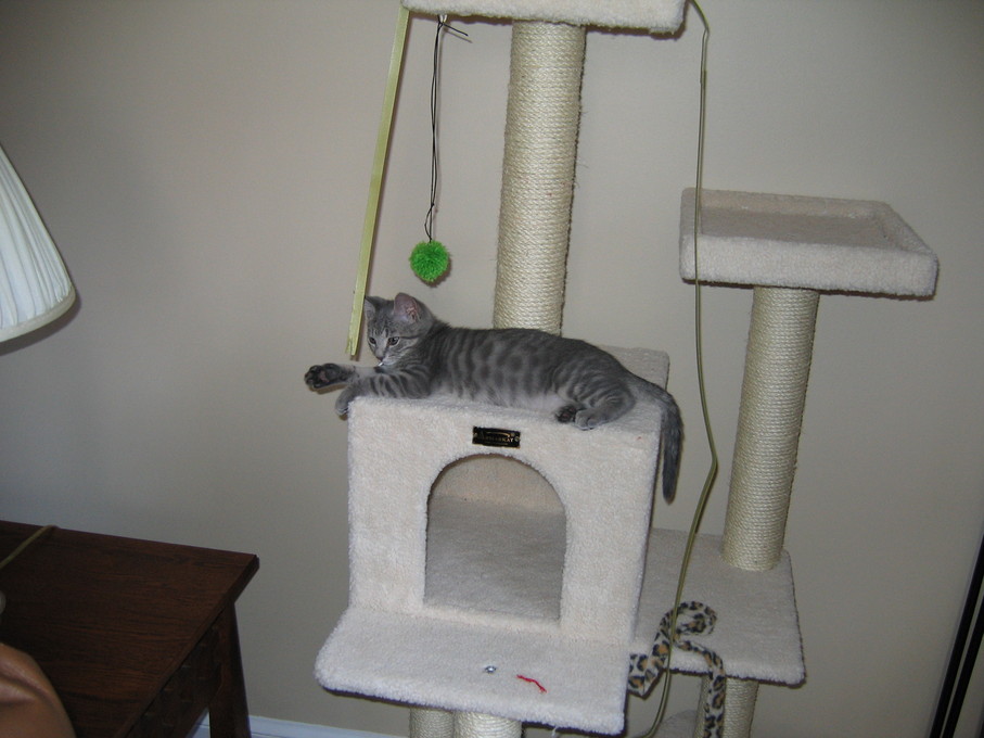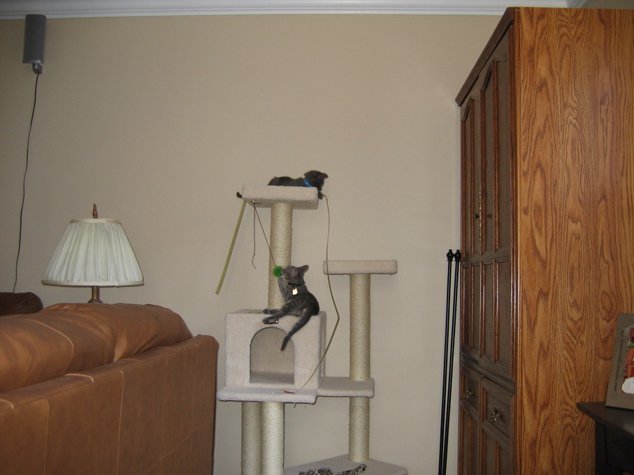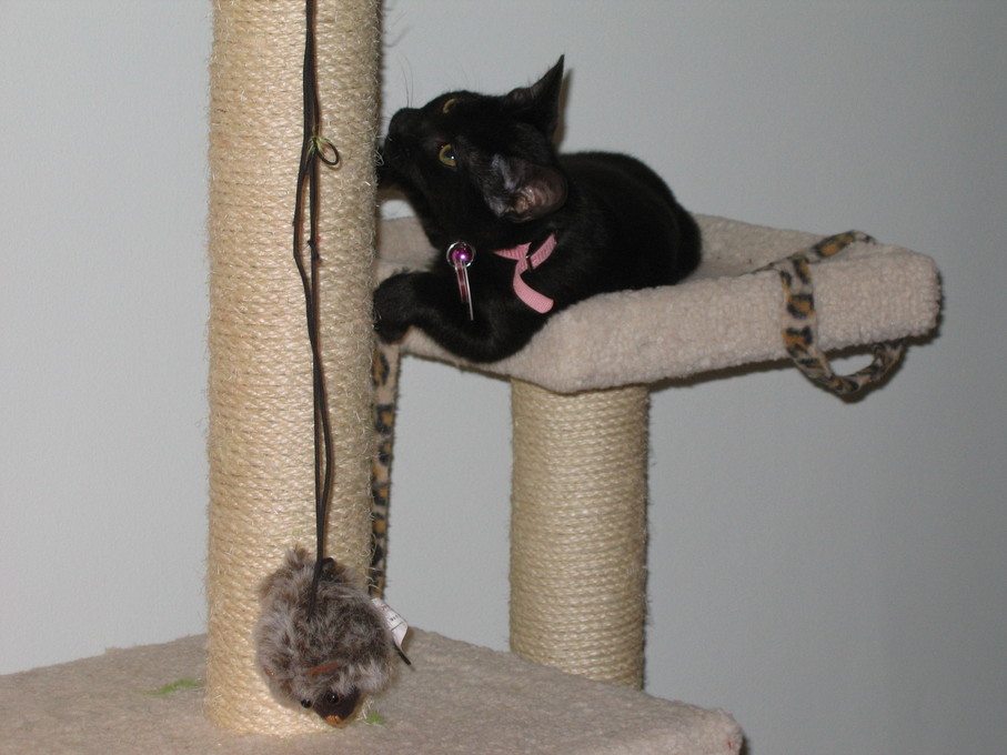Zathras examining the part of the cat tower that broke off.