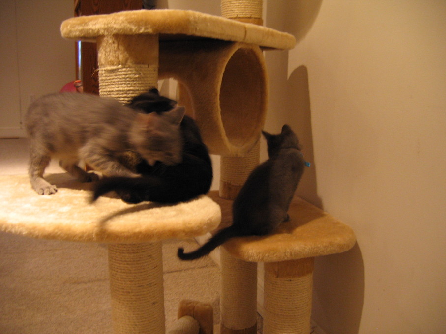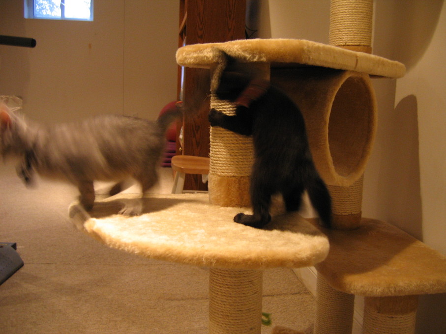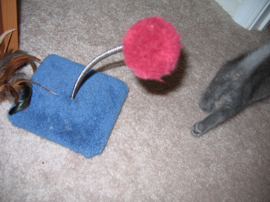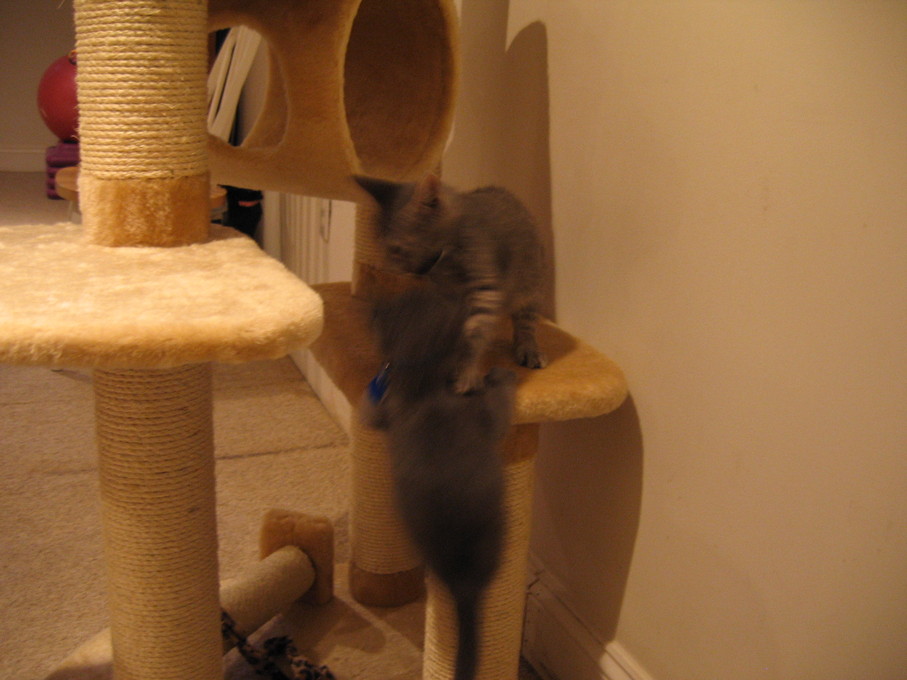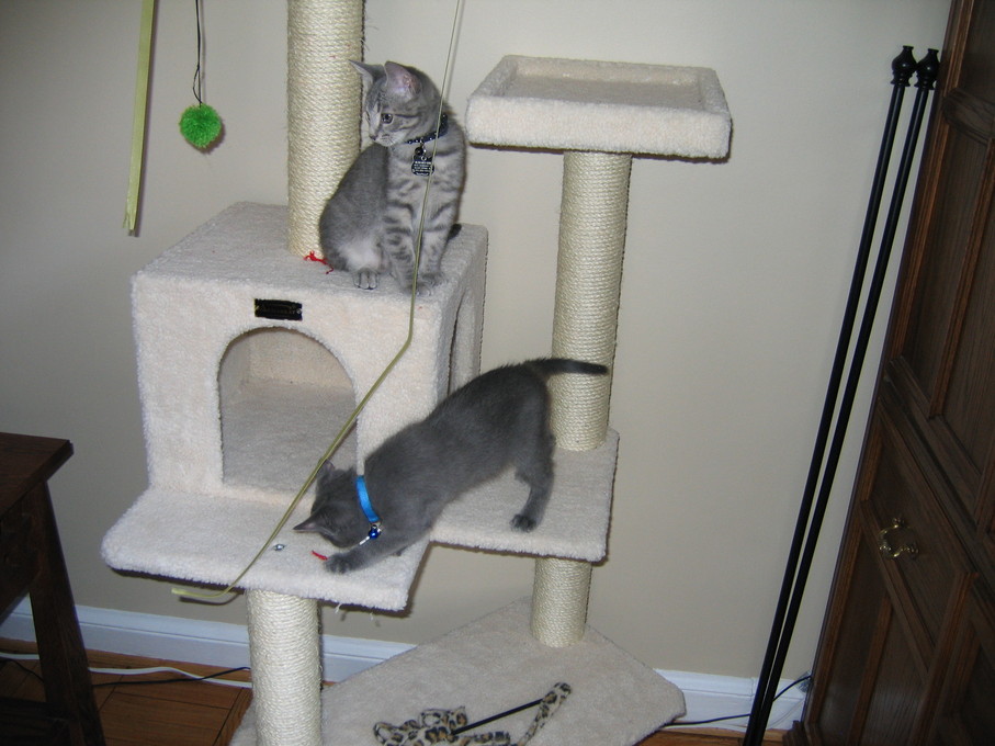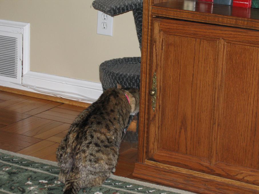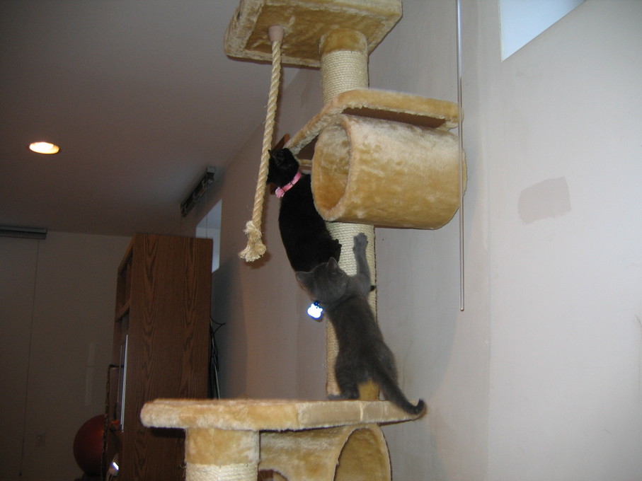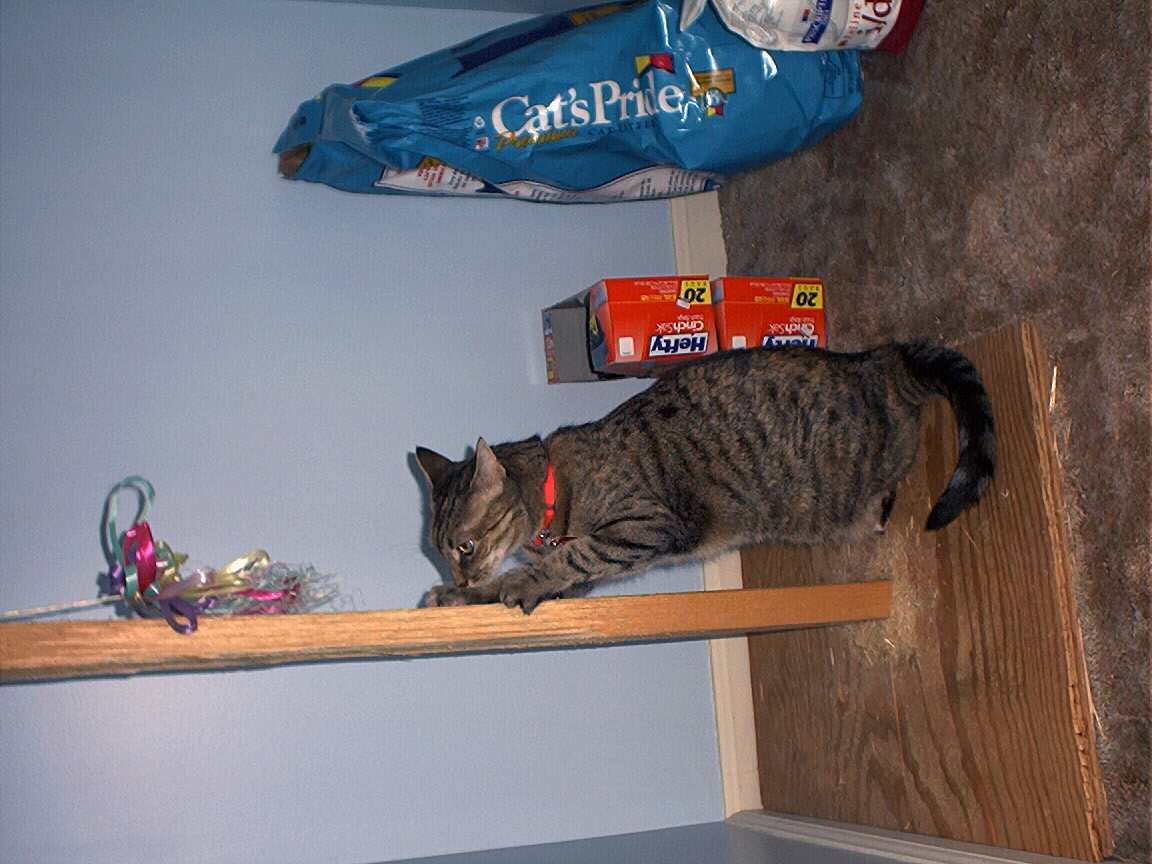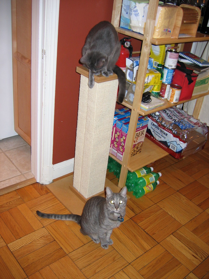 Zathras examining the part of the cat tower that broke off.