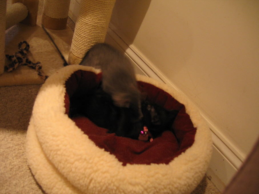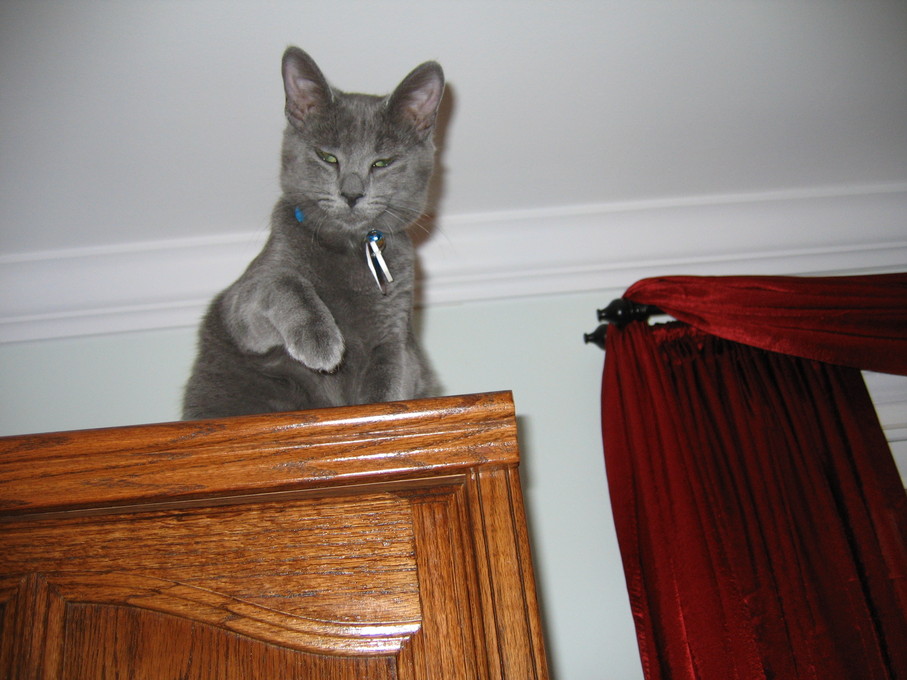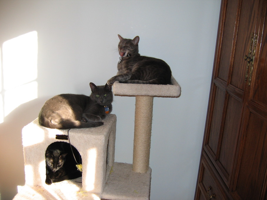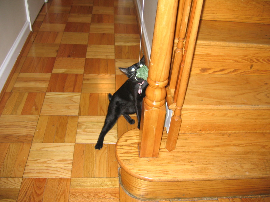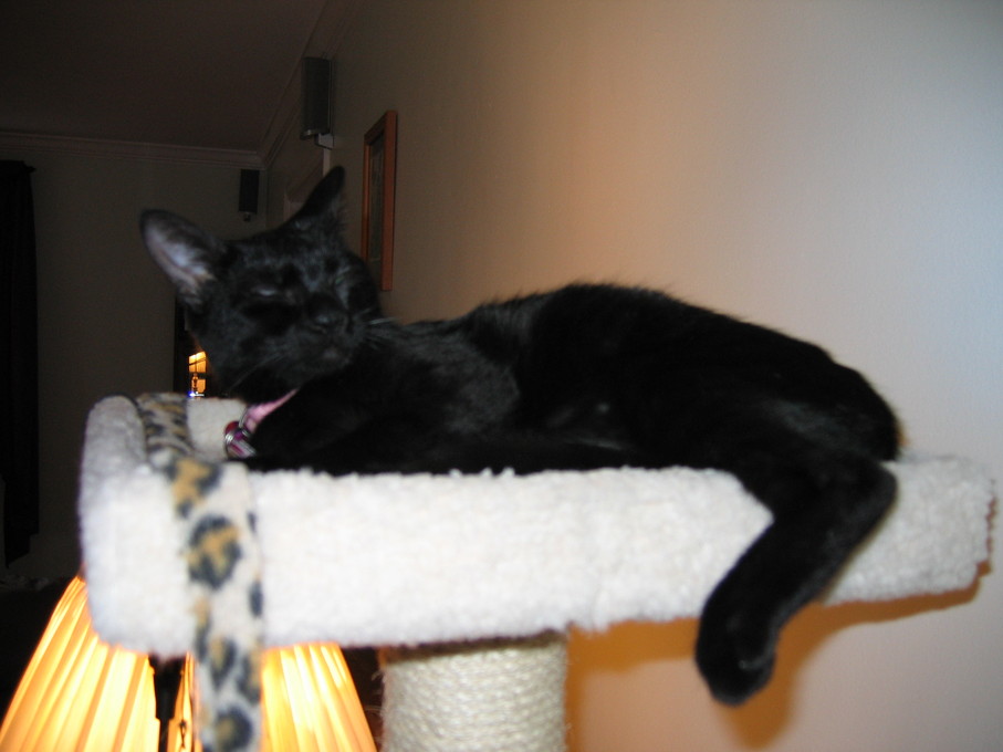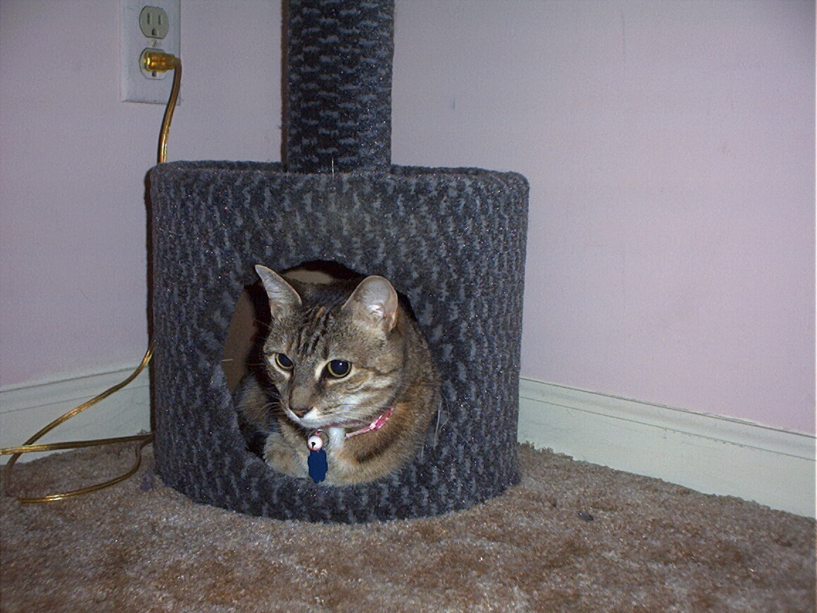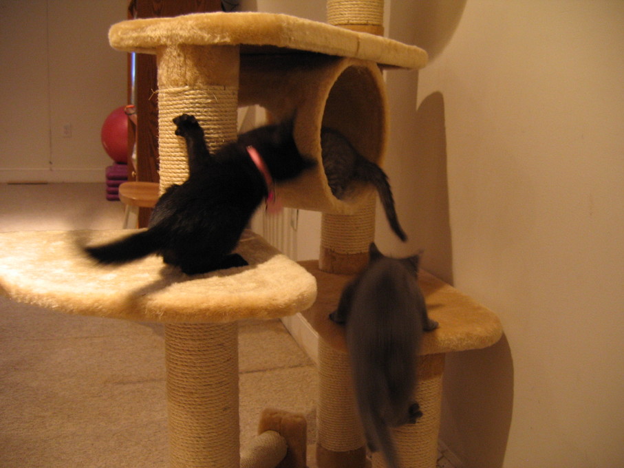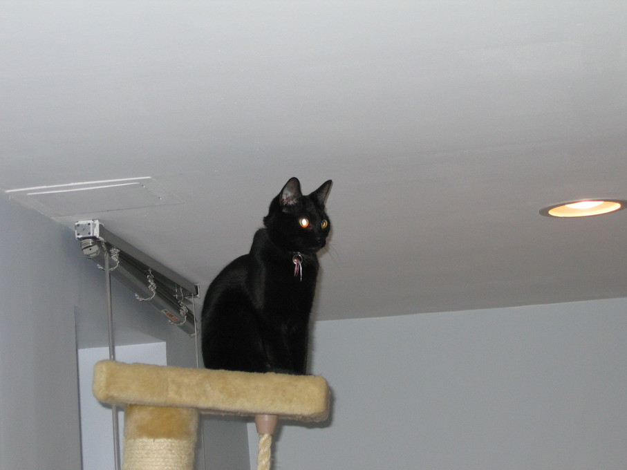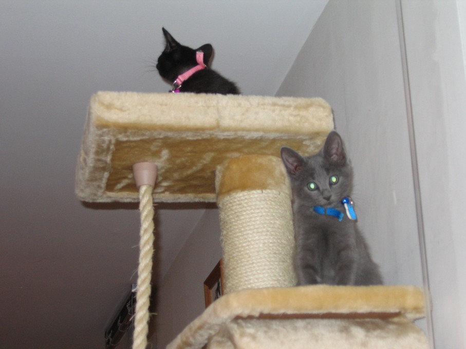 Zathras examining the part of the cat tower that broke off.