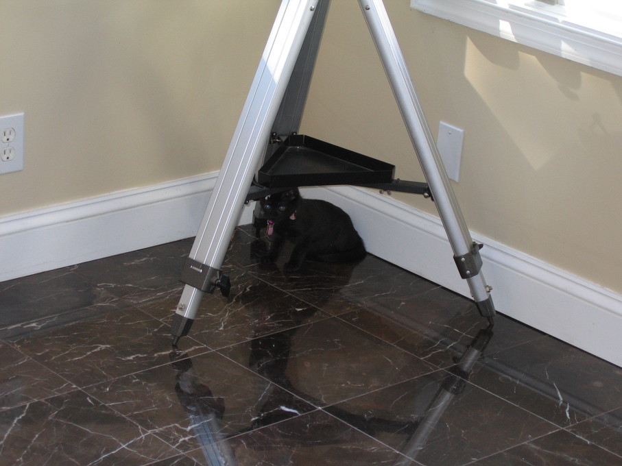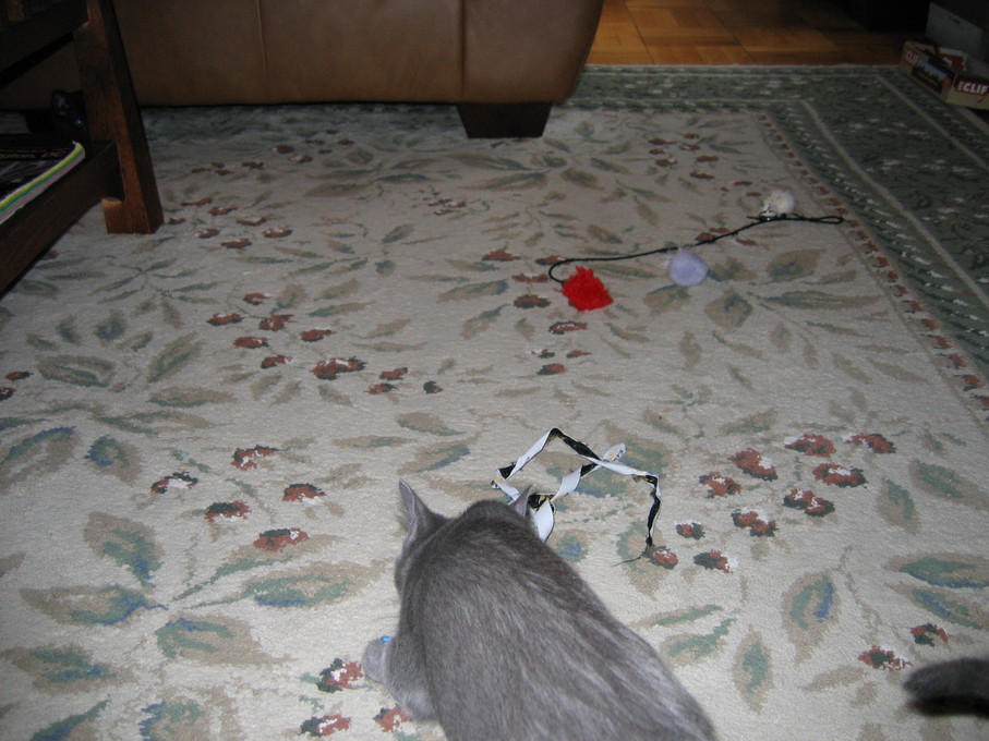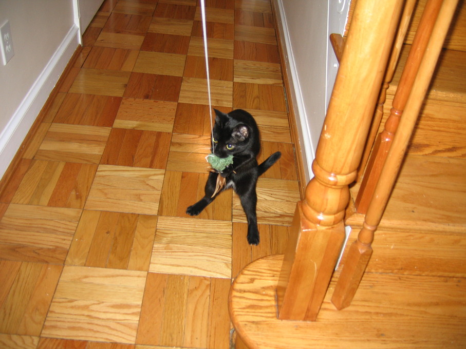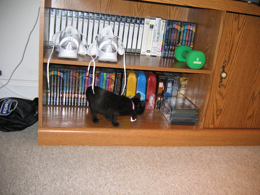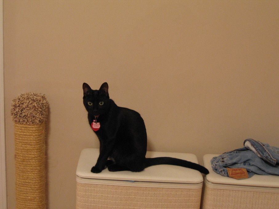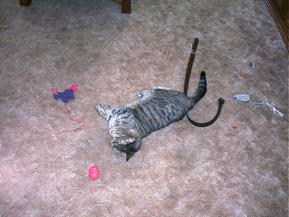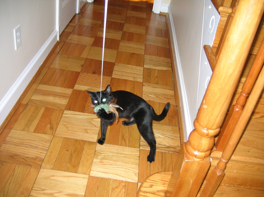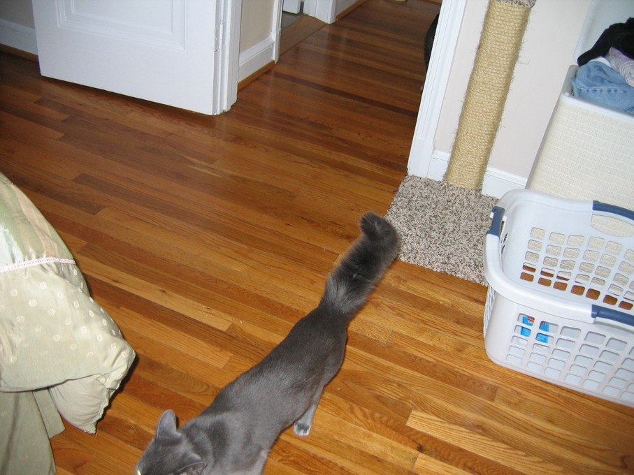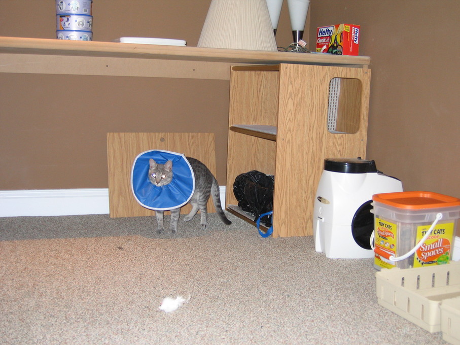 Zathras examining the part of the cat tower that broke off.