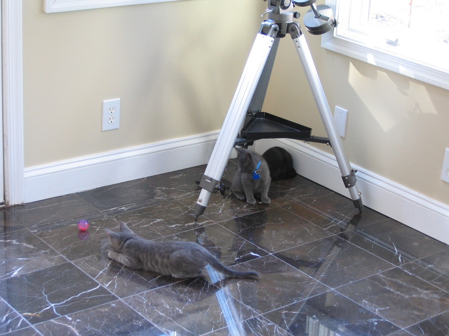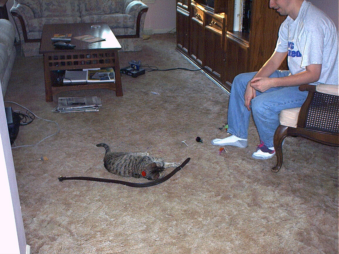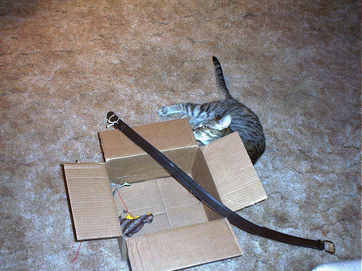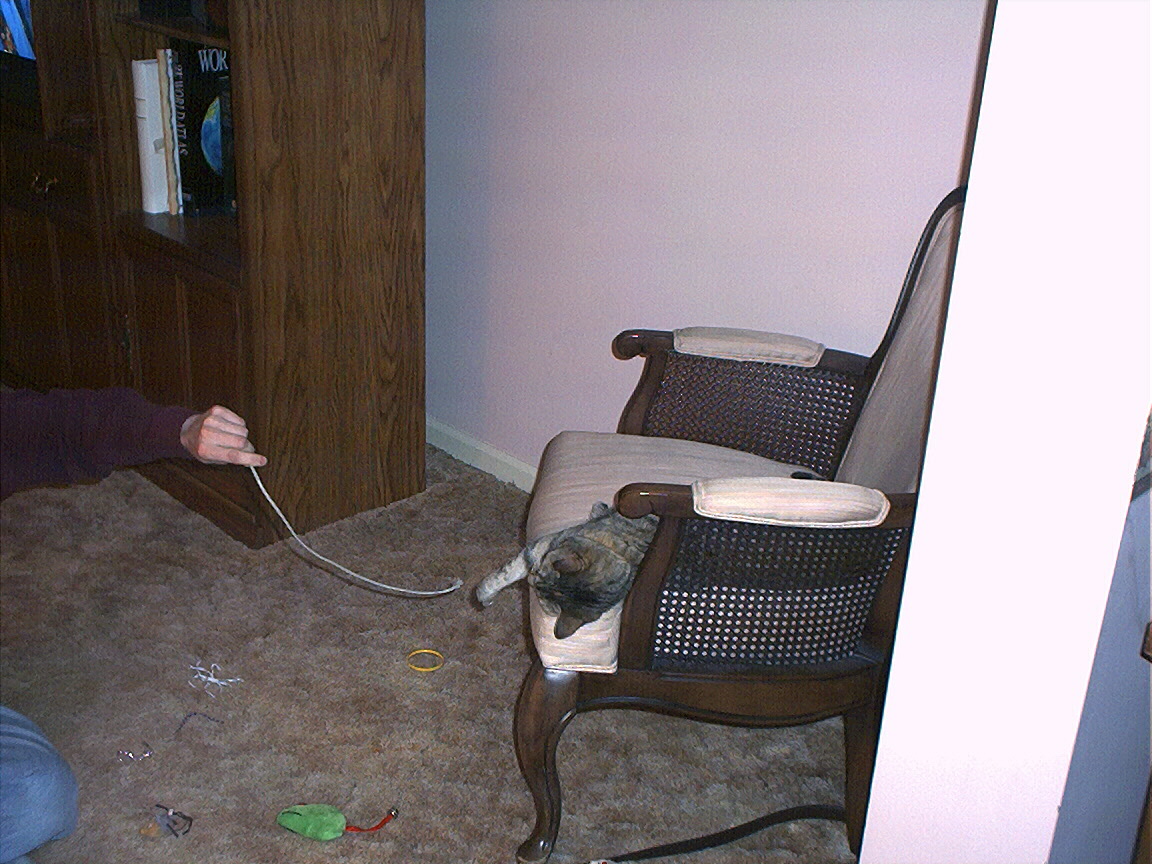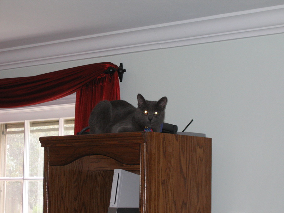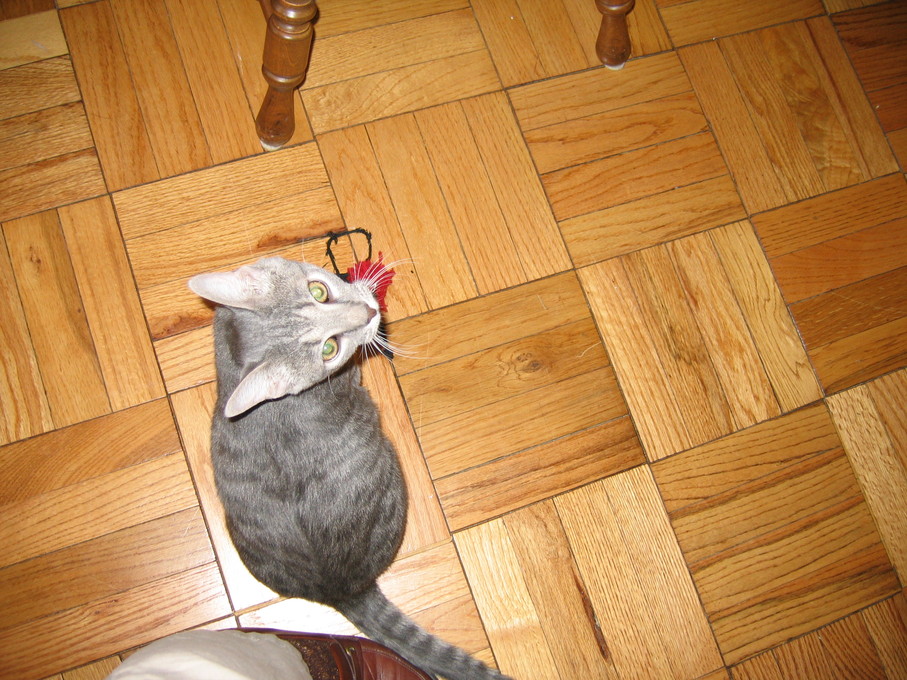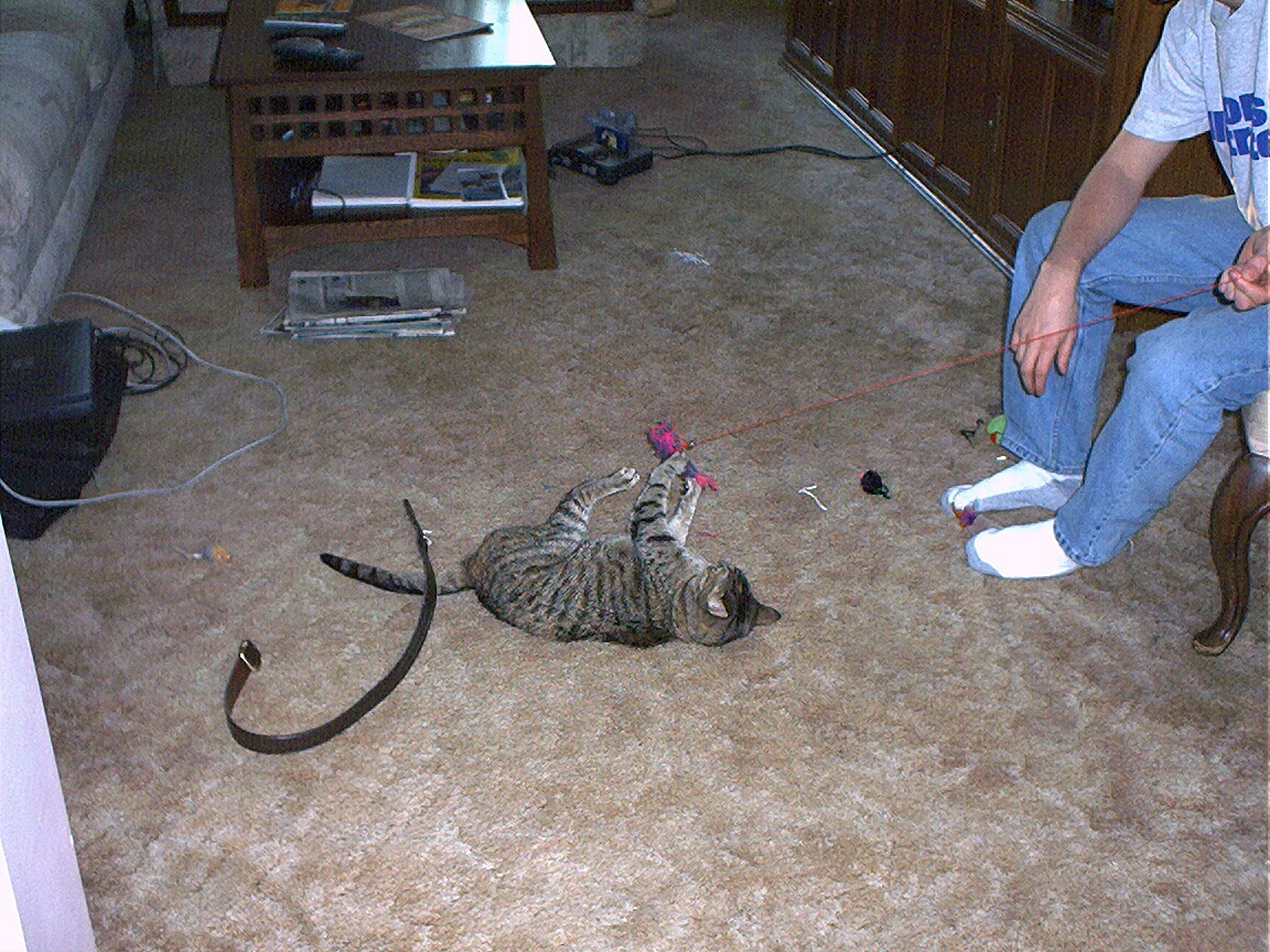 Zathras examining the part of the cat tower that broke off.