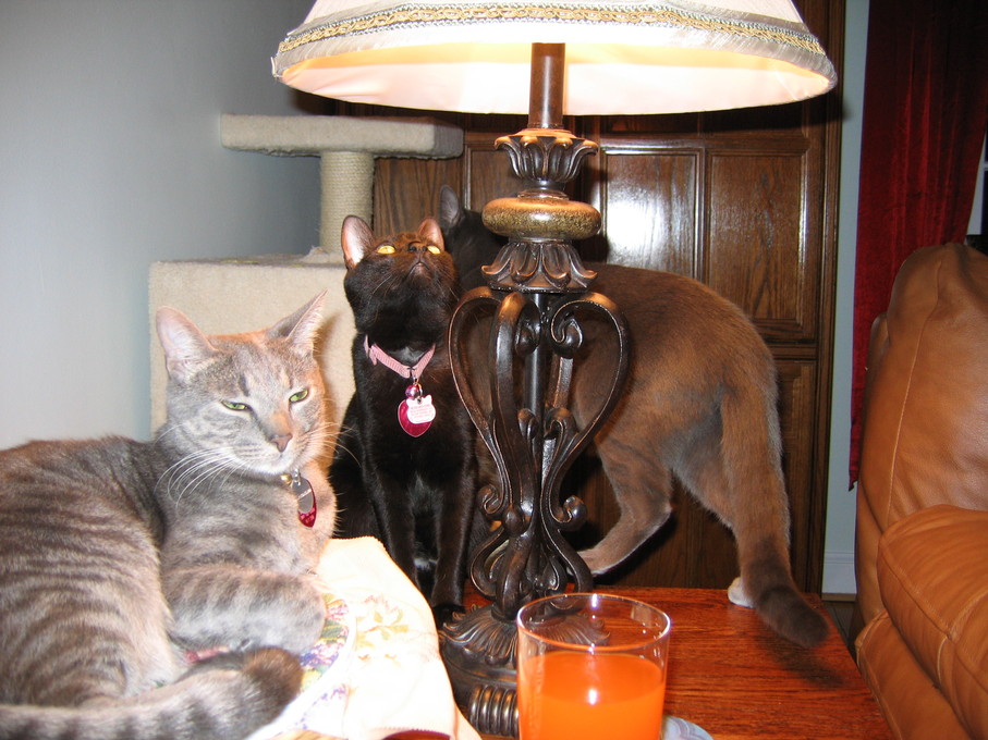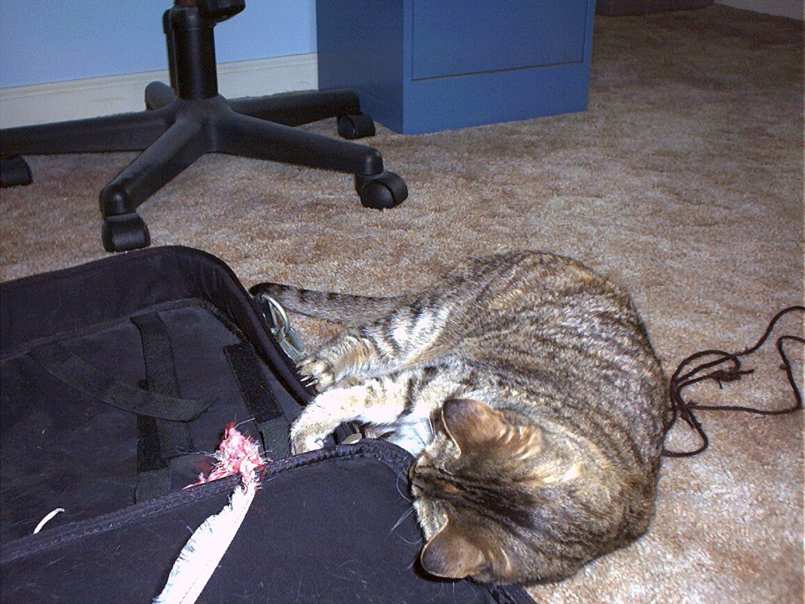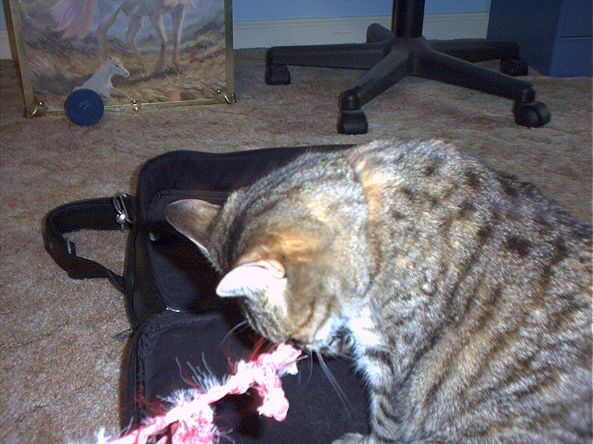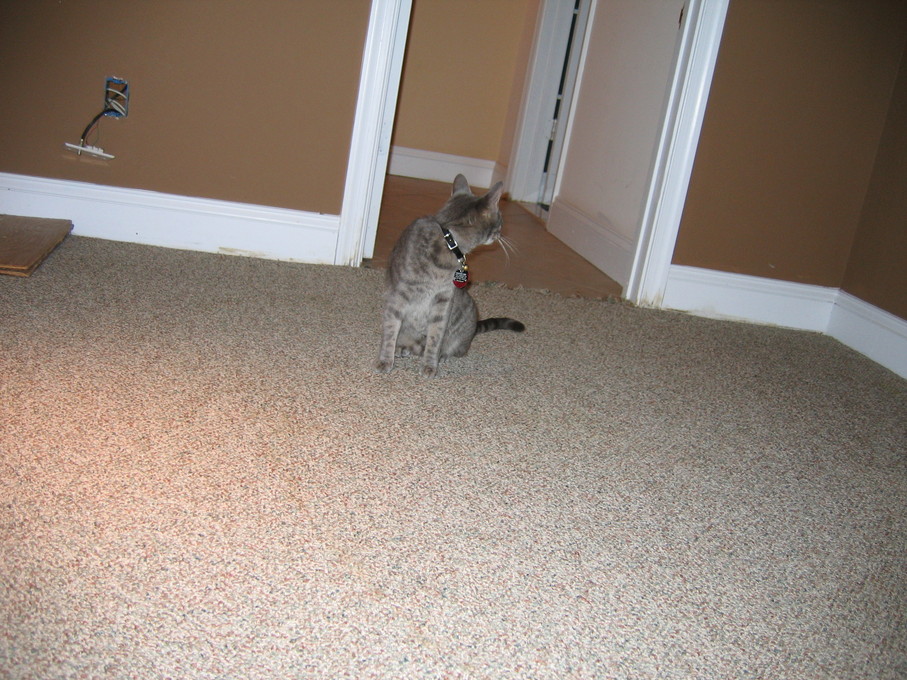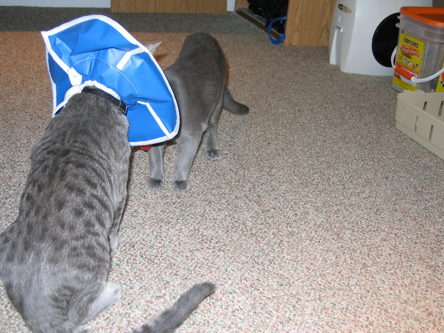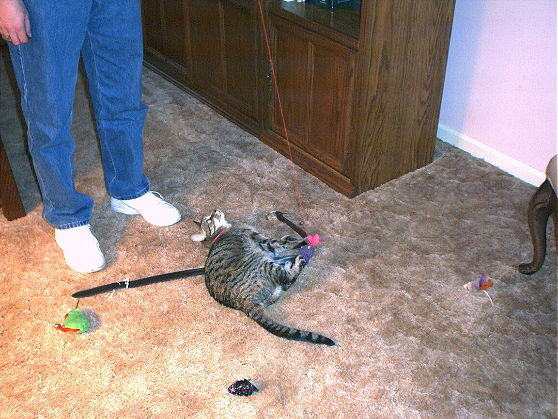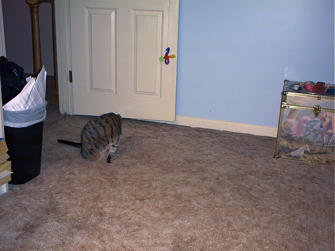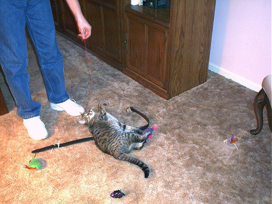 Zathras examining the part of the cat tower that broke off.